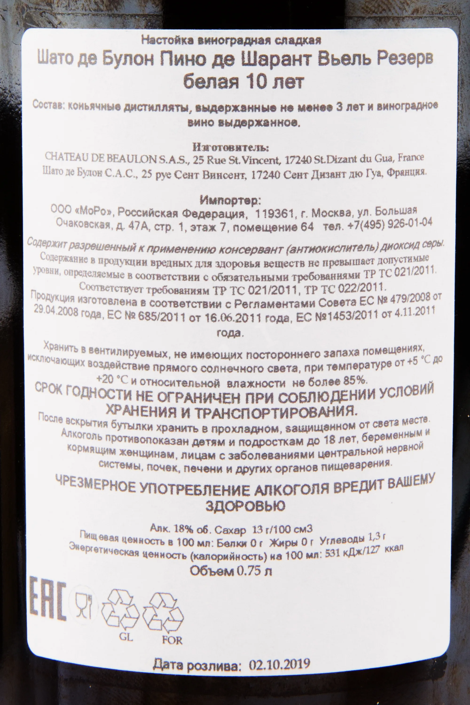 Chateau de Beaulon Vielle Reserve Or 10 years 0.75 л купить - Пино де Шарант Шато де Булон Вье Резерв Ор 10 лет цена в магазине