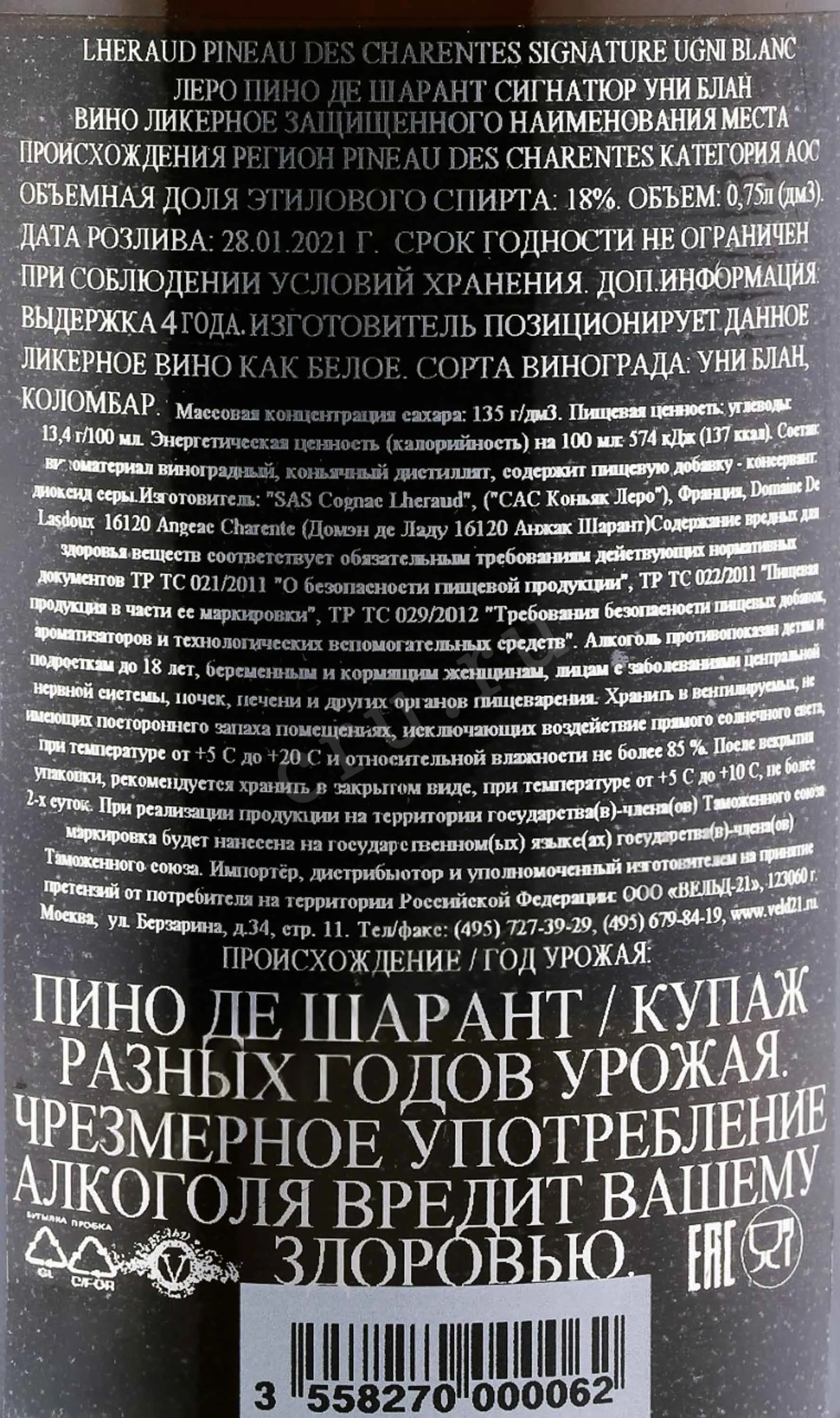 Пино де Шарант Lheraud Signature Ugni Blanc 2021 года 0,75 л — белое ликерное вино из региона Шаранта во Франции. Виноград выращивается на известняковых и глинисто-известняковых почвах, характерных для коньячных терруаров. Урожай 2021 года прошёл в условиях переменчивой погоды, однако виноделам удалось сохранить свежесть и баланс ягод. Производство основано на старинной технологии семьи Леро: в свежий виноградный сок добавляют коньячный спирт, что останавливает брожение и сохраняет природные сахара. Напиток выдерживается около четырёх лет в дубовых бочках. За это время формируются мягкая текстура и сложный аромат. Пино де Шарант этого дома ценится за стабильное качество и традиционный стиль, отражающий опыт нескольких поколений.