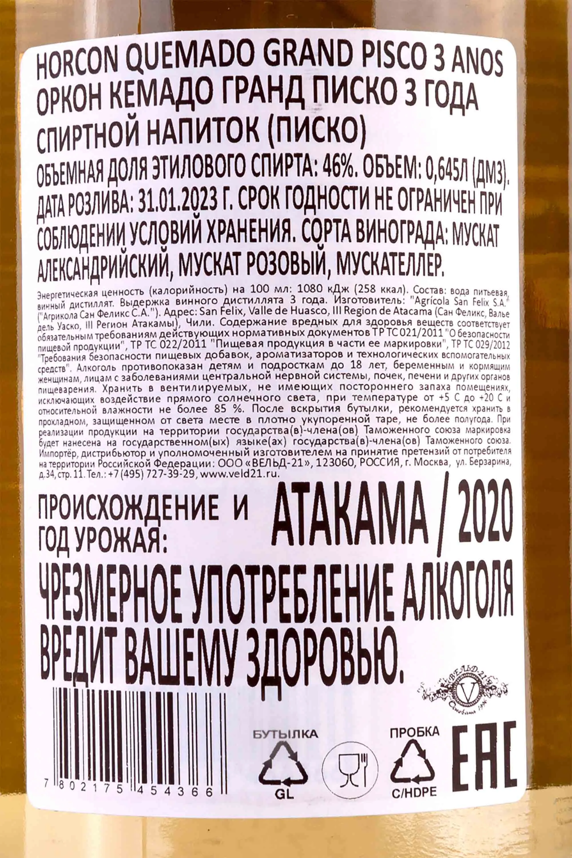 Horcon Quemado Gran Pisco 3 anoc gift box 0.645 л купить - Писко Оркон Кемадо Гранд 3 Года в подарочной упаковке цена в магазинег. Москва, ул. Профсоюзная, д. 16/1010:00-22:00 Ежедневно+7 (495) 920-20-02info@cru.ru