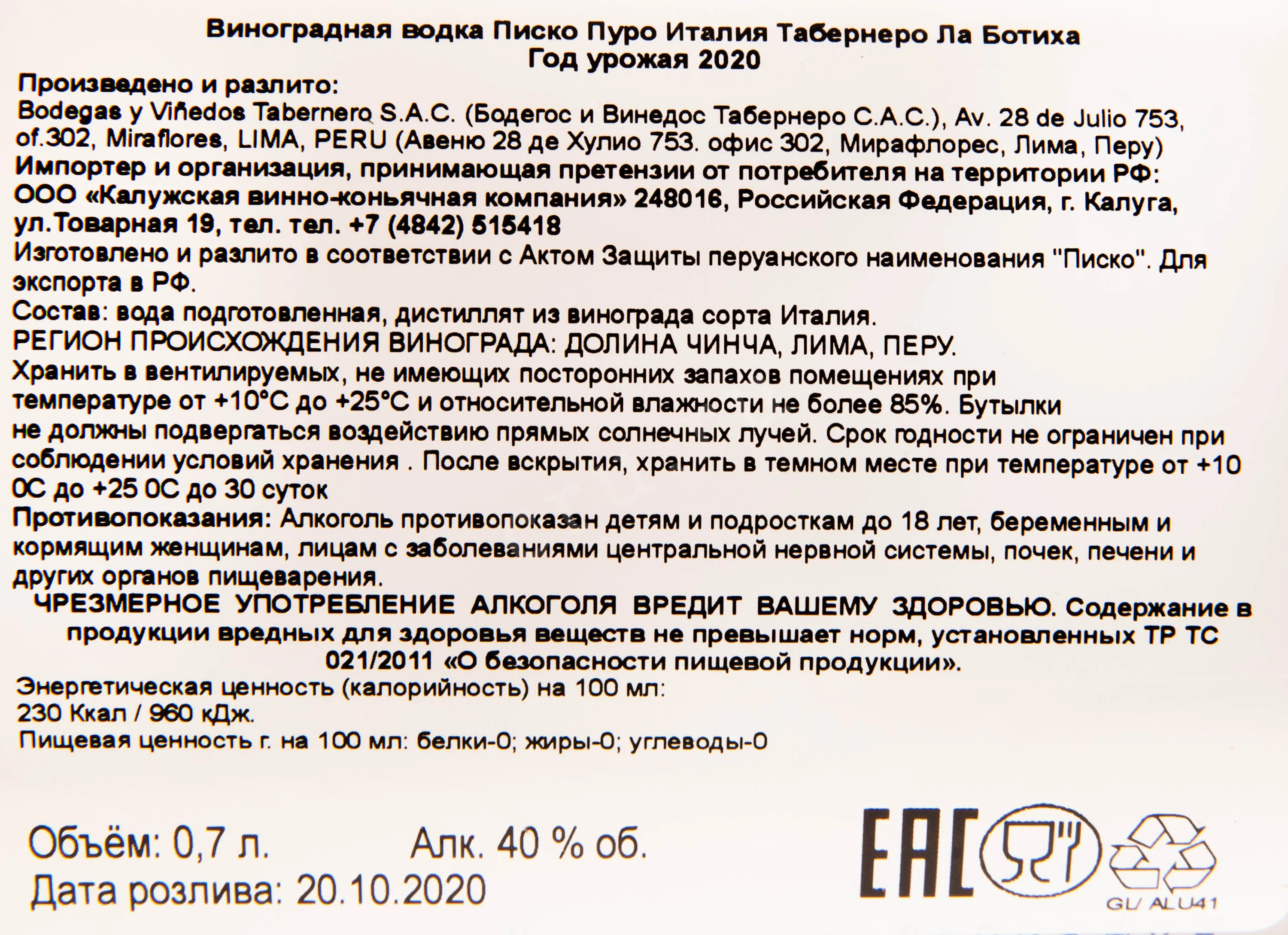 Tabernero La Botija Pisco Puro 2020 0.7 л купить - Писко Писко Пуро Италия Табернеро Ла Ботиха цена в магазине