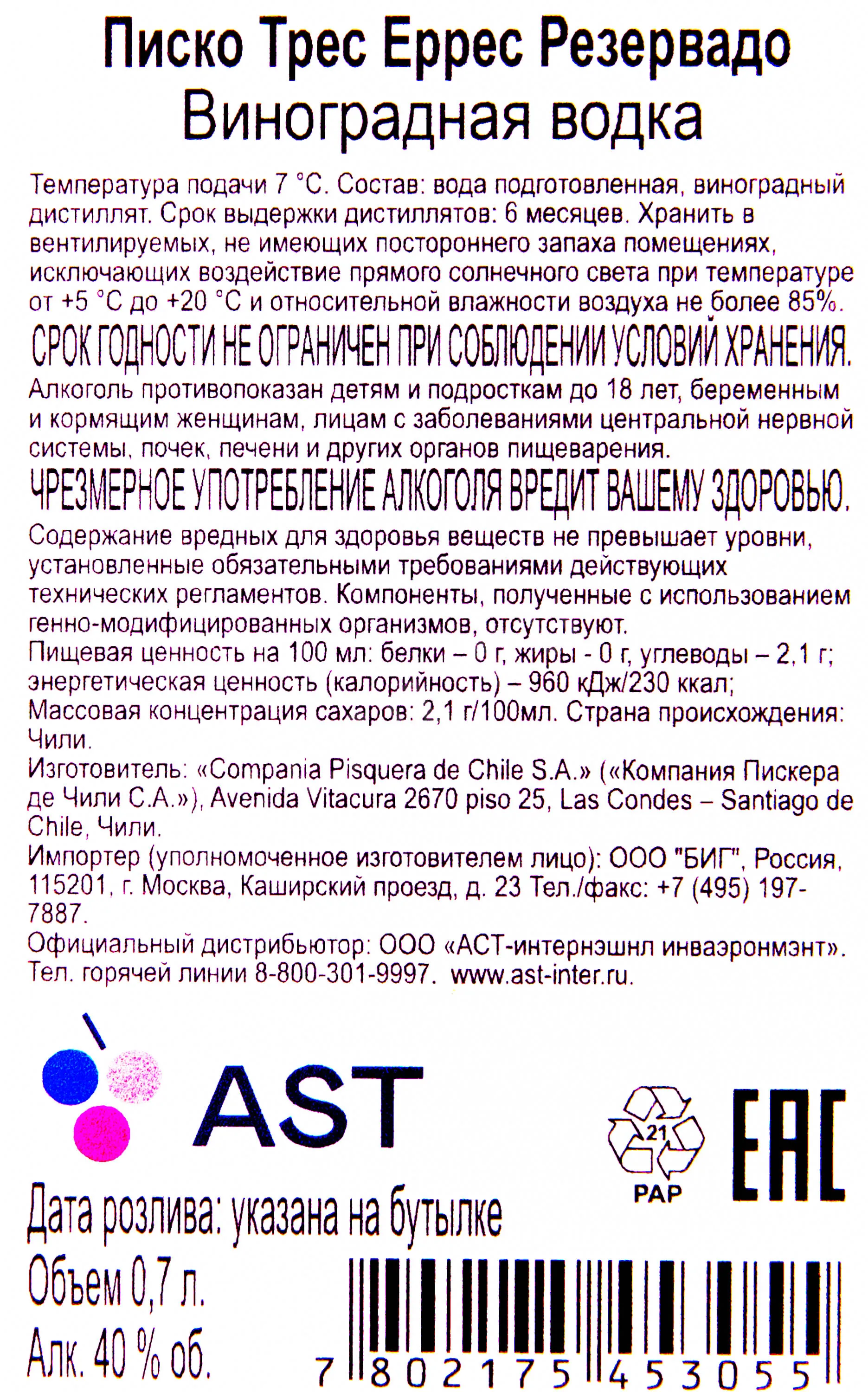 Писко Tres Erres Elqui 0.7 l – это национальный чилийский алкоголь, изготовленный из винограда мускатных сортов. 40-процентный напиток созревает в течение полугода в бочках из белого американского дуба.