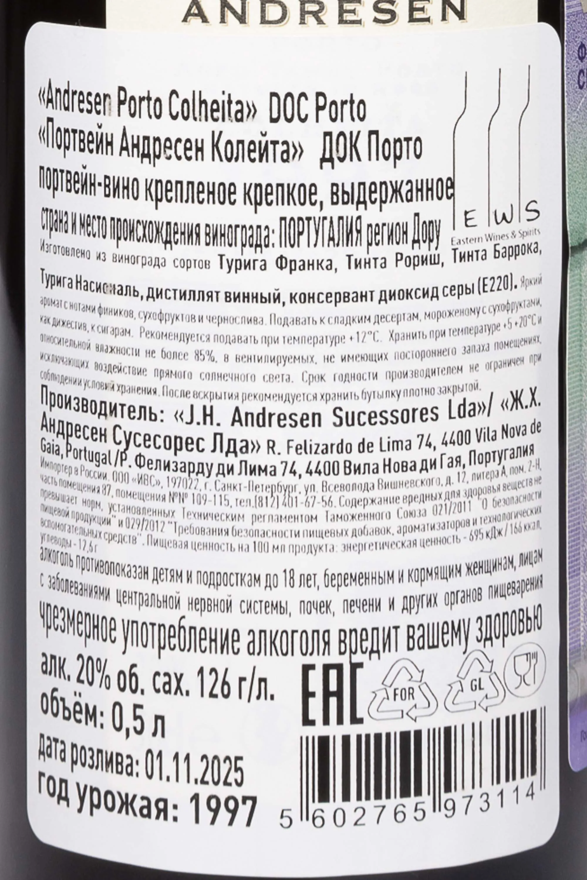 Портвейн Andresen Colheita DOC в тубе 1997 года 0,5 л создан в классической манере колейты и демонстрирует мягкость вкуса и зрелость характера. Виноград был собран в верхней части долины Дору, где крутые террасированные склоны и сланцевые почвы дают ягоды с плотным и насыщенным вкусом. Урожай 1997 года считают удачным: тёплый сезон чередовался с прохладными ночами, что помогло сохранить кислотность и богатую ароматику. Брожение проходило в традиционных чанах при контролируемой температуре с ранней остановкой процесса, чтобы сохранить природную сладость. Долгая выдержка в бочках из португальского дуба придала вину сложность и округлость. Порто Андресен Колейта 1997 года отмечен в профильных рейтингах и получил высокие оценки от критиков, что подтверждает его элитный статус.