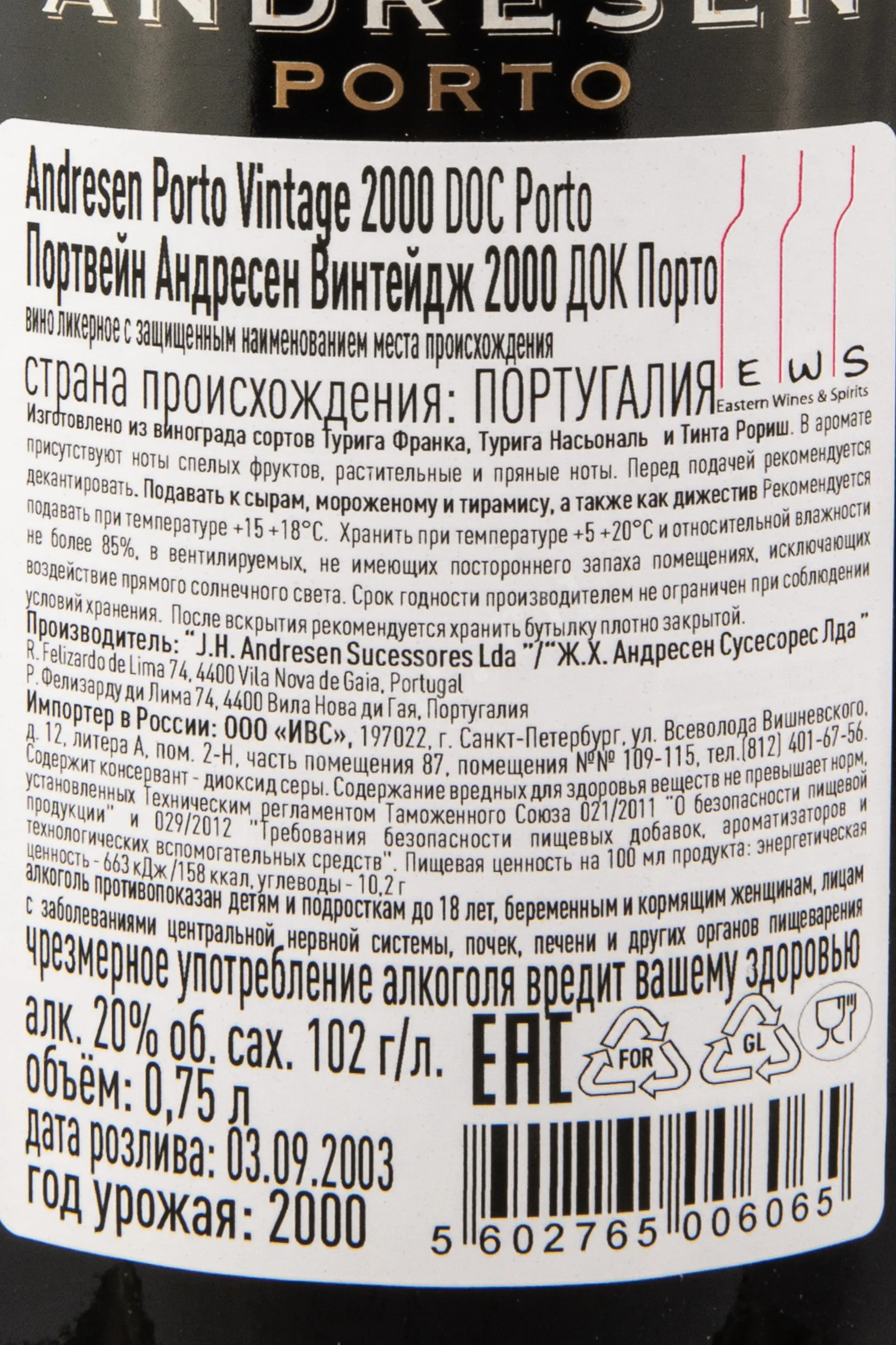 Портвейн Andresen Vintage gift box 2000 г. – красное сладкое крепленое португальское вино из знаменитой Долины Дору. После сбора урожая ягоды помещают в каменные лангары и давят. Затем сусло ферментируют. Процесс ферментации останавливают добавлением в сусло виноградного бренди. Выдерживается порто в дубовых бочках 4 года. Винтажные портвейны отличаются тем, что имеют более мощную структуру. Это крепленое вино, приготовленное из нескольких сортов винограда одного года. И еще один факт нужно знать — оно выдерживаются еще в течение 15 лет в бутылках.