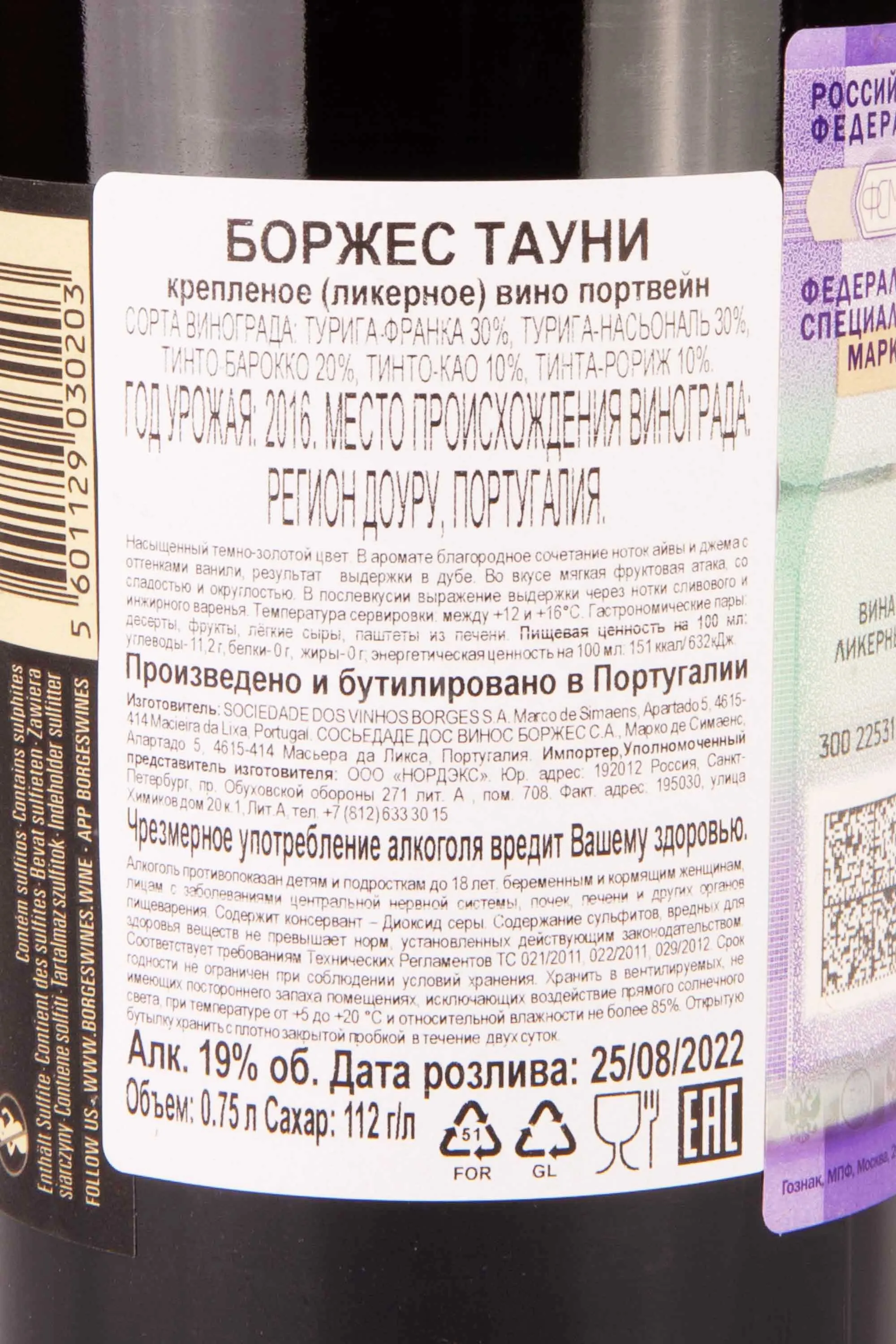 Портвейн Borges Tawny 2019 года 0,75 л — креплёное сладкое вино, выдержанное в дубе. Виноград для него был выращен на террасах региона Дору на высоте около 600 метров над уровнем моря, на участках со сланцевыми почвами с включениями гранита. Они хорошо удерживают тепло и обеспечивают лозам устойчивость в засушливый период. Сбор урожая проводили вручную. После дробления ягод применяли короткую мацерацию. Ферментацию останавливали добавлением виноградного спирта при достижении нужного уровня сладости. Затем портвейн выдерживали несколько лет в небольших старых дубовых бочках. Стиль Тони отличается мягким и гармоничным, но в то же время богатым и глубоким вкусом.