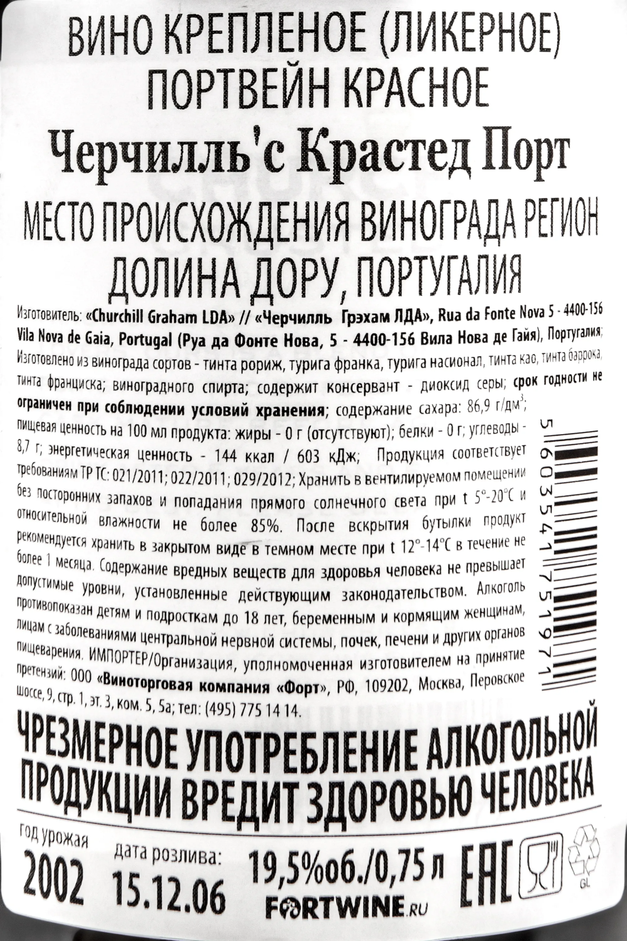 Портвейн Churchill`s Crusted Porto, bottled in 2006 г. 0.75 l – это нефильтрованный сладкий порто, который был изготовлен из отборного винограда категории «А» и бутилирован в 2006 году. Выдержка 20-процентного крепленого вина протекала в дубовых бочках в течение 2-х лет, а после еще 3 года в бутылке.
