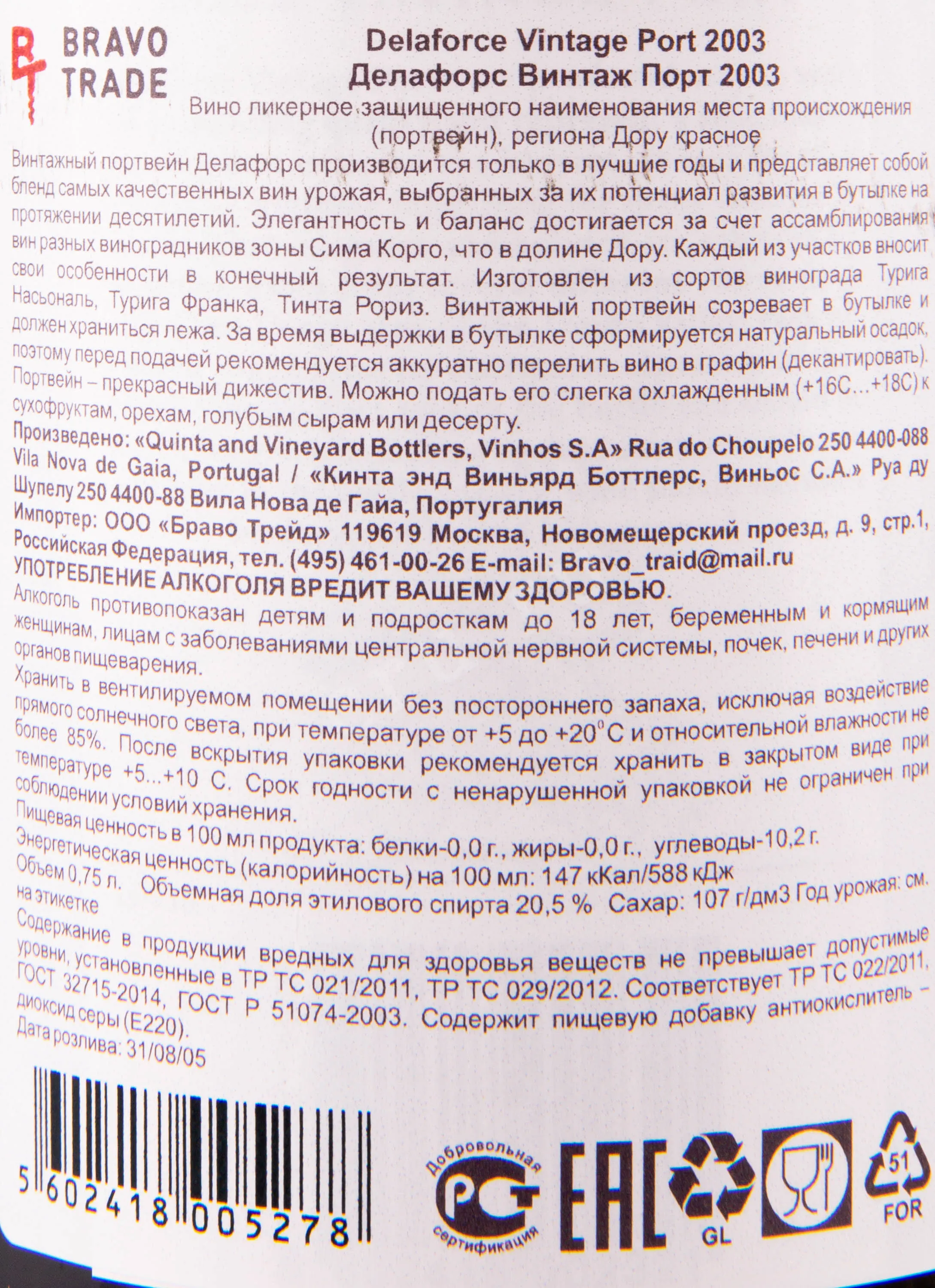 Портвейн Delaforce Vintage 2003 г. gift box 0.75 l – это эксклюзивный португальский винтаж из урожая 2003 года, представленный в фирменной подарочной коробке из натурального дерева. Сладкое крепленое вино крепостью 20.5% выдерживается в дубовых бочках до 6 лет.