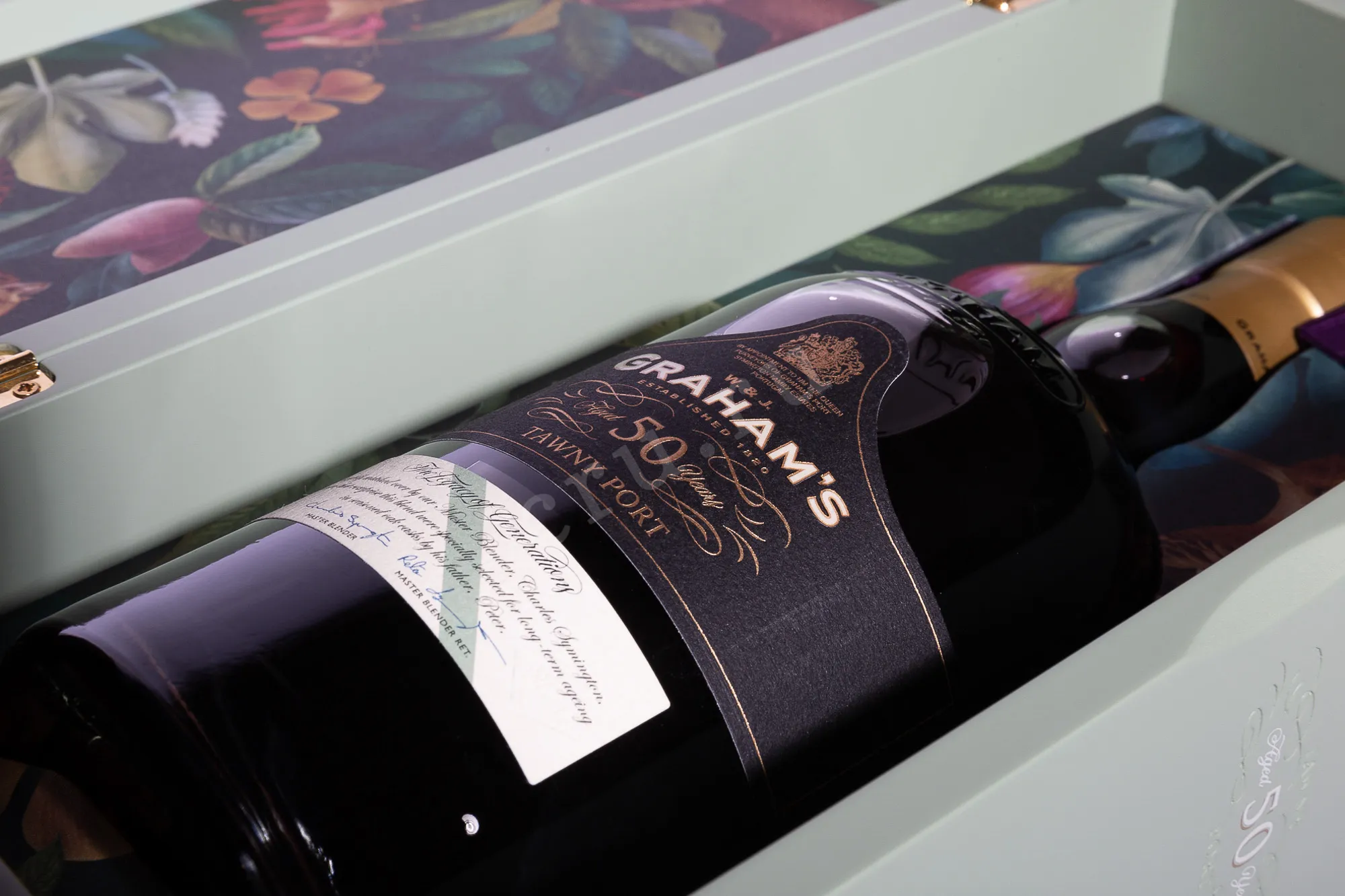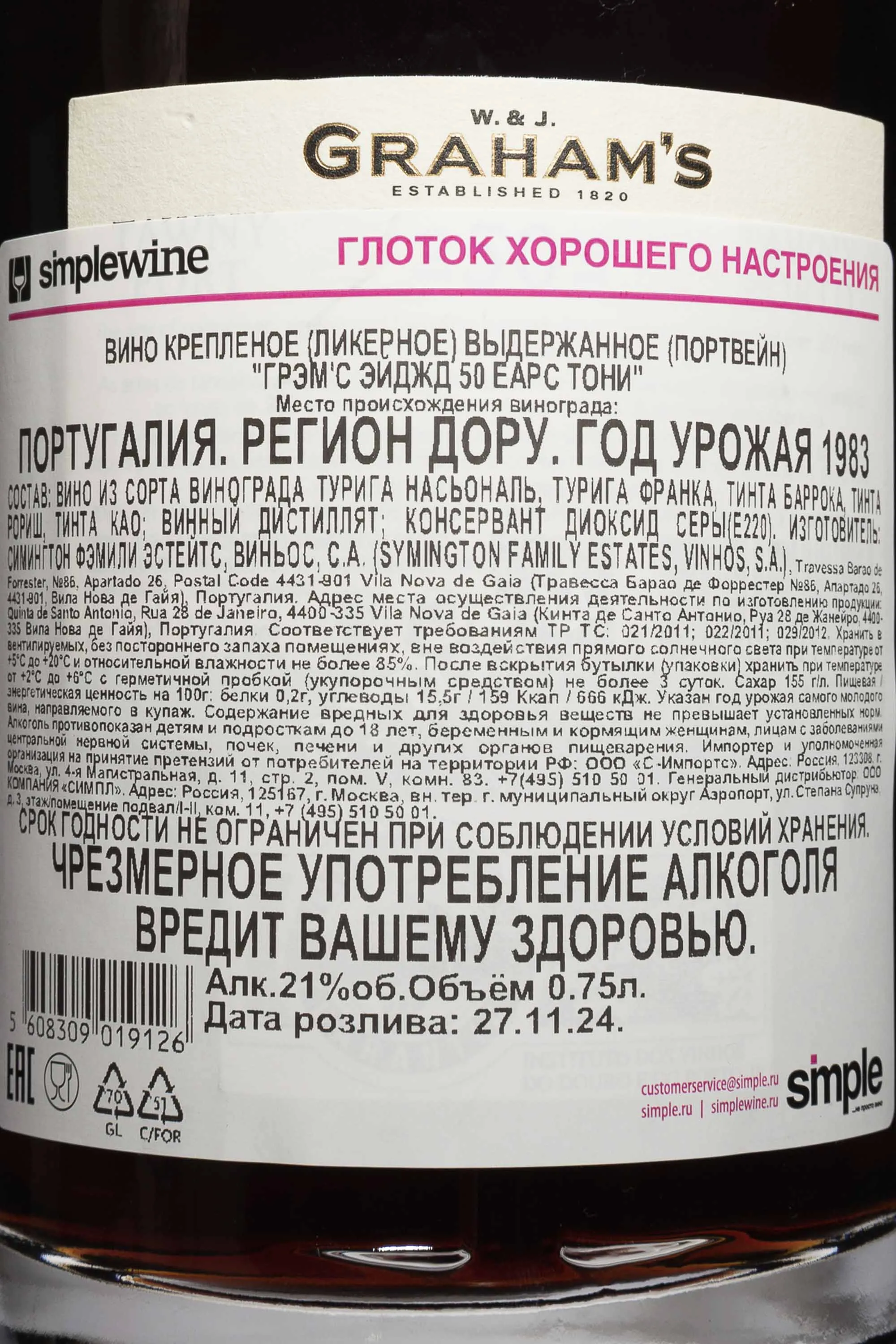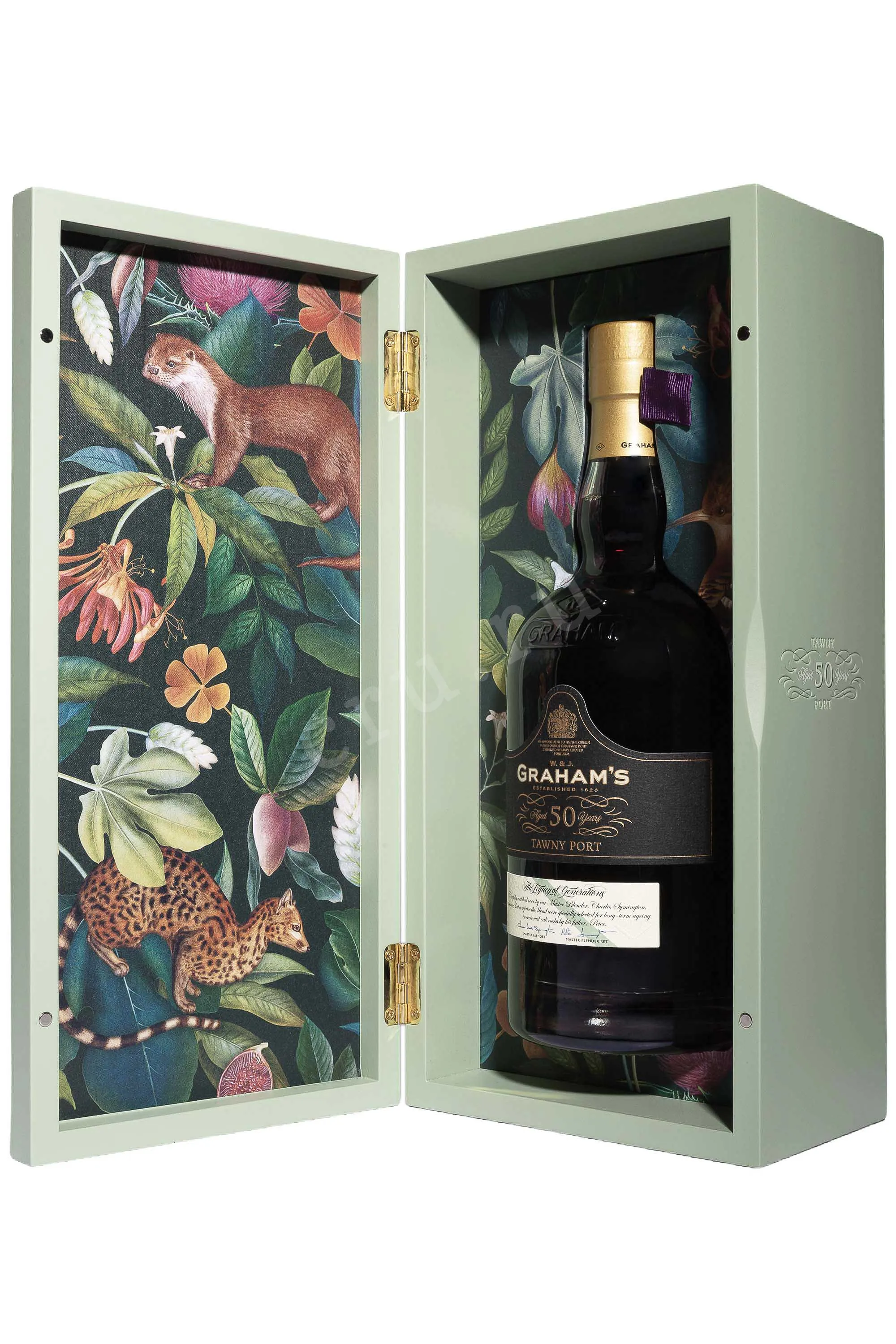 Портвейн Grahams Aged Tawny 50 лет в деревянной коробке 1983 года 0,75 л создан в насыщенной и выдержанной стилистике классического красного крпеленого вина. Для него использован виноград из четырёх поместий семьи Грэм, что делает его редким и уникальным. Лозы растут на крутых склонах субрегиона Сима Коргу, где сланцевые почвы и резкие перепады температур позволяют ягодам достигать высокой концентрации вкуса. 1983 год был стабильным и тёплым, что обеспечило равномерное созревание традиционных сортов долины Дору. Короткая ферментация проходила в стальных резервуарах, после чего молодое вино укрепили винным спиртом и переместили в дубовые бочки-пипы объёмом около 550 литров. Очень долгая выдержка придала напитку характерную глубину. Винтажный порто Грэмс Эйджд Тони 50 лет создаётся только в из урожаев удачных годов. Коробка выполнена в виде коллекционной шкатулки и украшена рисунками флоры долины Дору, а элементы дизайна отсылают к интерьеру английских домов XVI века.