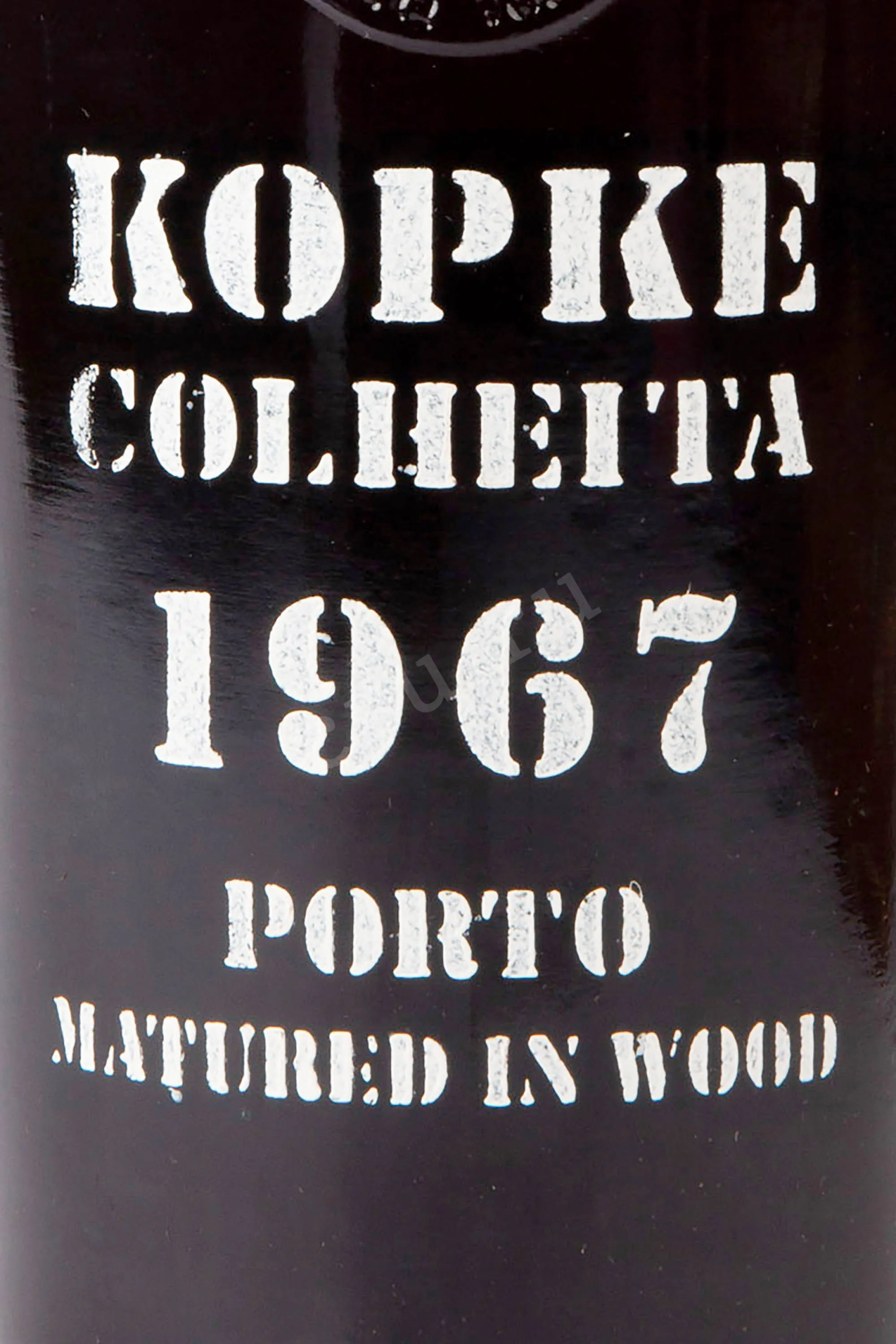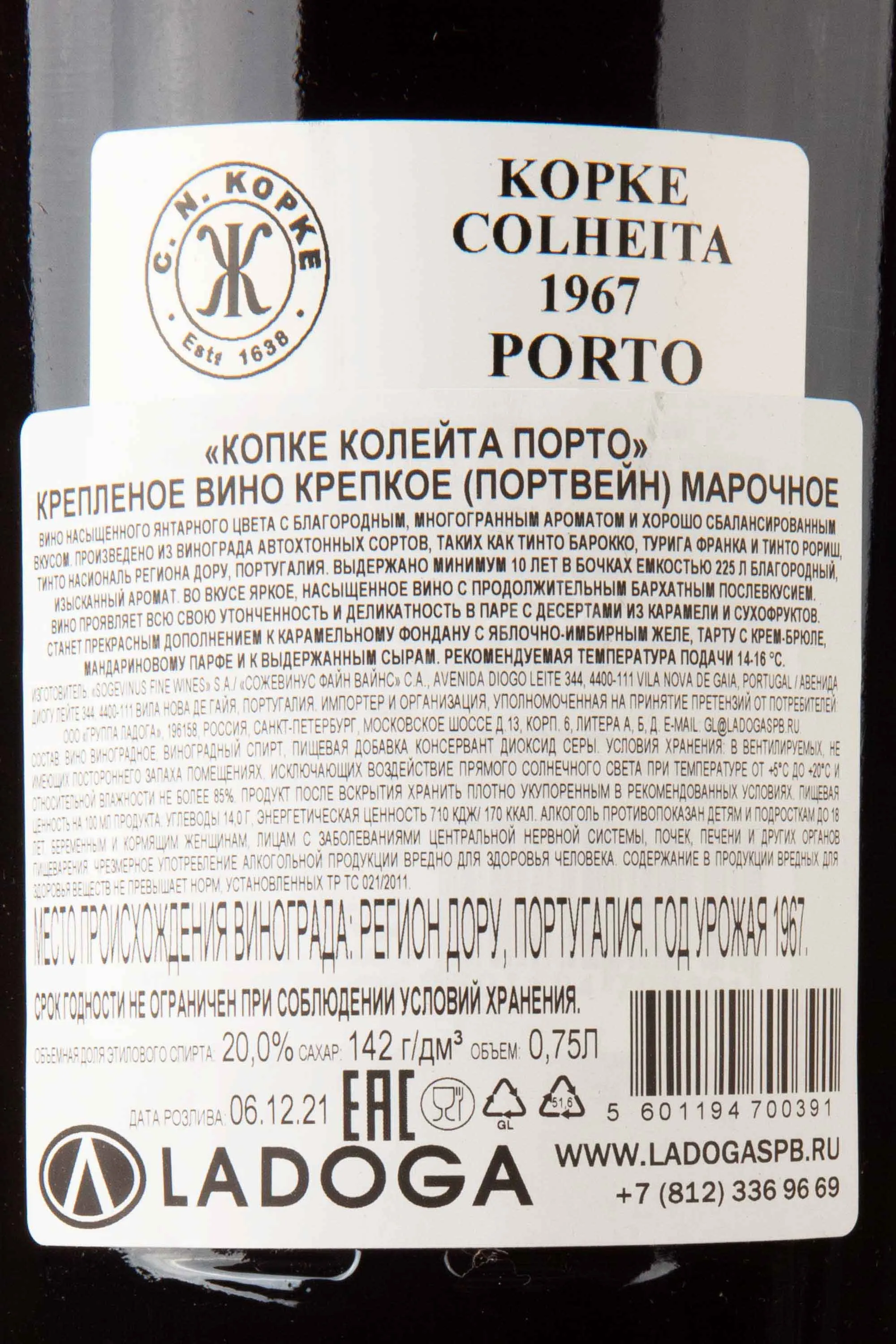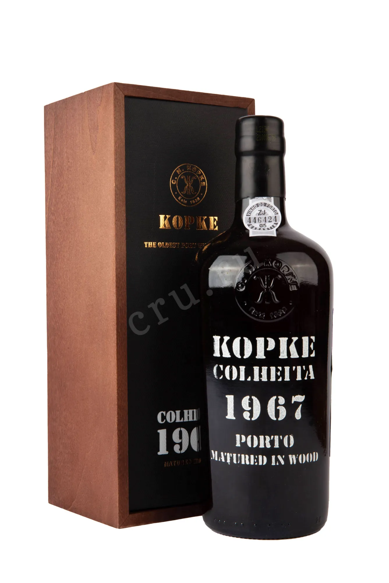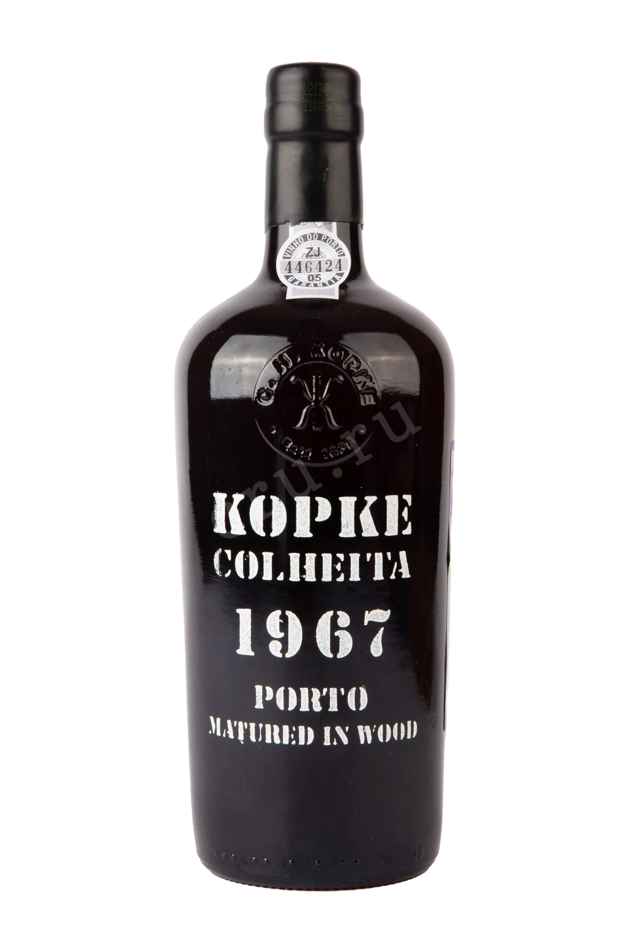 Портвейн Kopke Colheita 1967 г. 0.75 л — красное крепленое винтажное португальское вино из региона Дору. Сбор урожая осуществлялся вручную. Виноградные лозы, ягоды которых собирали вручную и использовали для производства напитка, произрастают на сланцево-песчаных почвах, в которых присутствует еще и гранит. Располагаются они на крутых склонах холмов долины, высота 600 м над уровнем моря. Виноград очистили от гребней, подвергли прессованию и мацерации. Ферментация осуществлялась при температуре 28-30 ºC. Далее сусло проходило стадию брожения, которая была прервана путем добавления виноградного спирта. После этого вино поместили в дубовые бочки и выдерживали не менее 7 лет. Отличный презент имениннику, который родился в 1967 г.