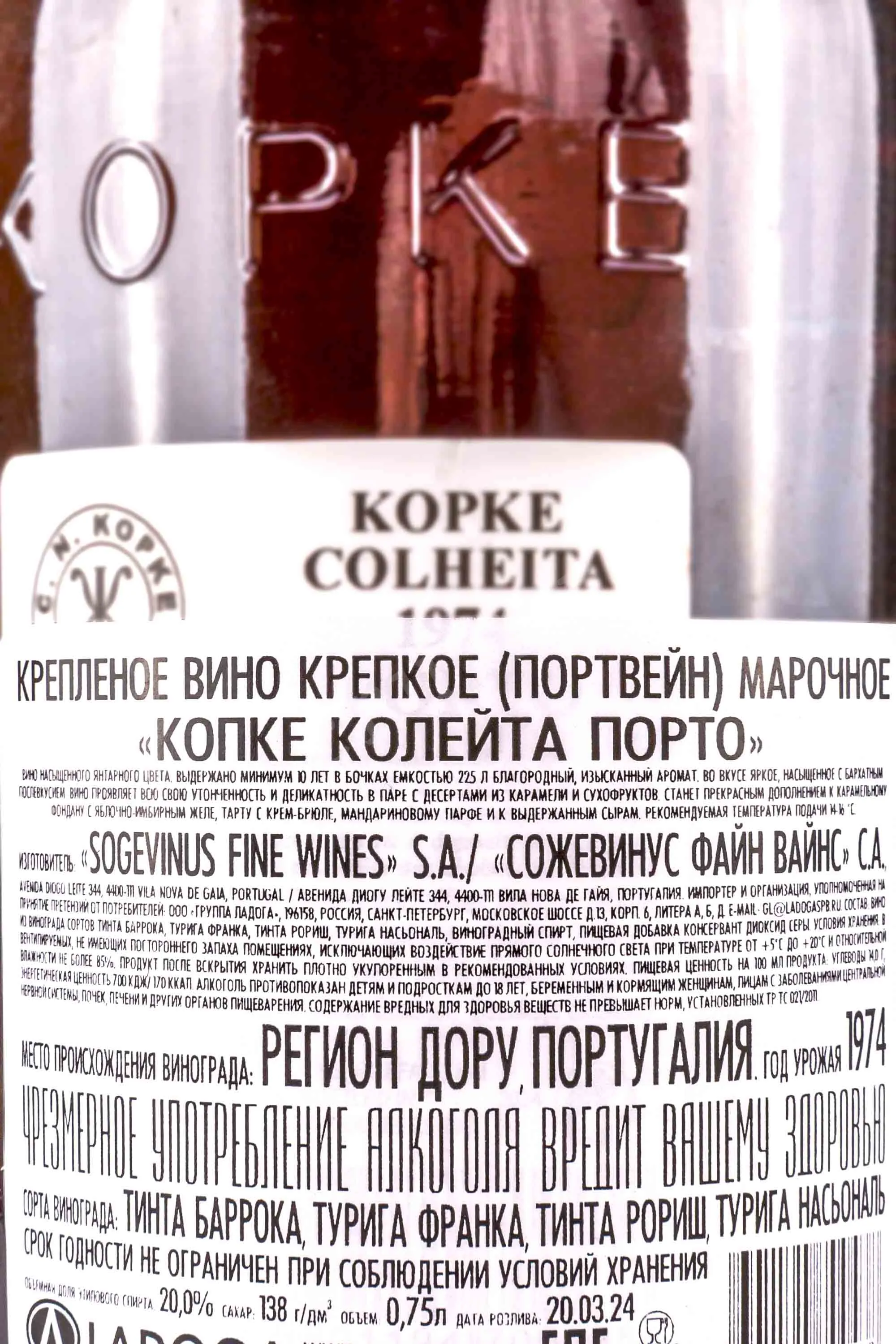 Портвейн Kopke Colheita 1974 года 0,75 л — винтажный, коллекционный, созданный одним из старейших винных домов Португалии. Виноград был выращен в долине Дору на горизонтальных террасах на высоте до 600 метров. Почвы ордовикского периода содержат множество осколков гранитного камня. 1974 год отличался стабильной теплой погодой, что позволило получить здоровые и зрелые ягоды. Урожай собирали ручным способом. После отделения гребней виноград прессовали и мацерировали с активной перекачкой сусла. Брожение проходило при температуре не выше 30 °C, затем добавляли виноградный бренди для остановки ферментации. Вино выдерживалось в дубовых бочках около четырех десятилетий. Длительная оксидация придала вкусу глубину и сложность. Бутылка сохраняет историческую форму, восковая капсула выполнена вручную.