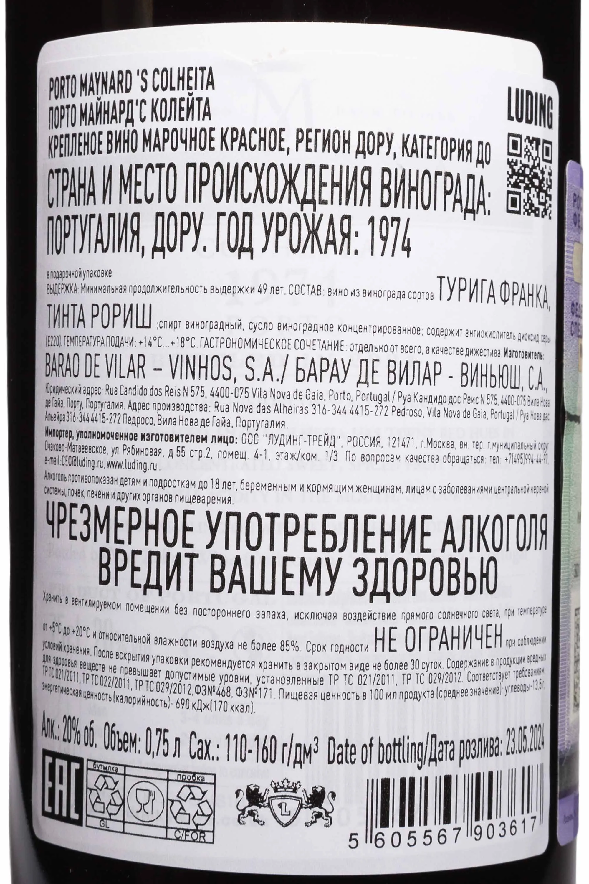 Портвейн Maynard's Colheita в деревянной коробке 1974 года 0,75 л представляет собой винтажный порто классического стиля из долины Дору. Лозы здесь растут на террасах с каменистыми почвами и дают небольшие, но концентрированные урожаи. 1974 год отличался стабильной погодой и благоприятными условиями для созревания ягод. Винификация проходила в бетонных лагарешах и стальных чанах с короткой мацерацией, после чего ферментацию остановили добавлением виноградного дистиллята. Выдержка в дубовых бочках длилась 49 лет, что придало напитку сложный профиль. Вино создано из автохтонных сортов, связанных с историей семейства ван Целлер, и отражает традиции производства. Выпуски Colheita получают высокие оценки критиков, а редкие винтажи считаются коллекционными.