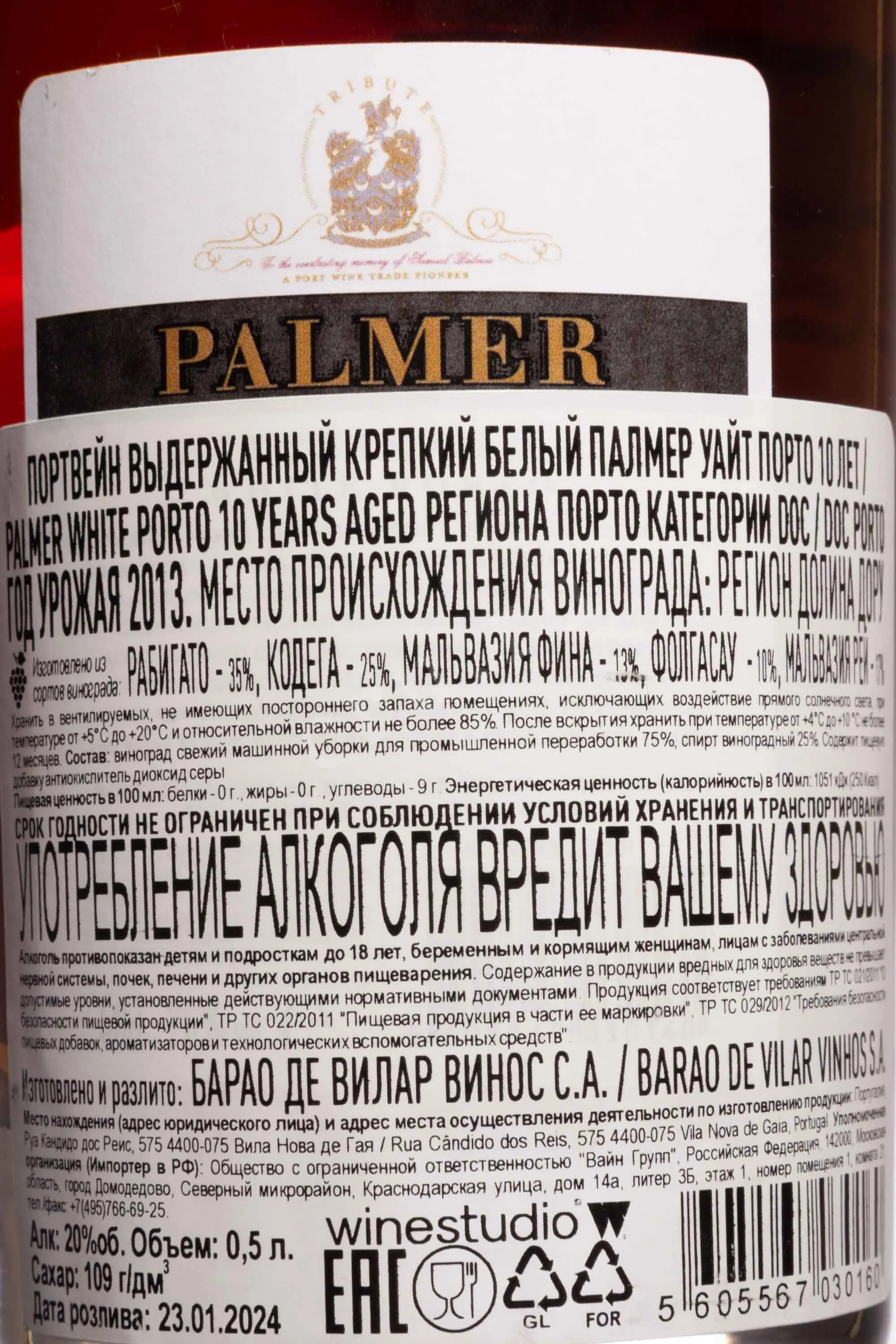 Портвейн Palmer White 10 лет 2013 года 0.5 л — выдержанное крепленое белое вино классического стиля из долины Дору. Оно получило 91 балл из 100 возможных от критика Роберта Паркера («экстраординарное»). Виноград для него был выращен на террасных склонах с каменистыми почвами и резкими перепадами температур, что помогает сохранить свежесть и ароматность ягод. 2013 год был благоприятным. Лето выдалось тёплым и сухим, без экстремальной жары, а сбор урожая осенью проходил в стабильных погодных условиях, что позволило виноделам получить хорошо сбалансированное сырьё. Виноград собирали вручную, аккуратно отделяли от гребней и мягко прессовали. Ферментация протекала естественным образом в стальных ёмкостях и длилась несколько дней, после чего вино укрепляли винным спиртом. Дальнейшая выдержка в дубовых бочках объемом 225 л заняла десять лет, за счет чего портвейн приобрел сложность и глубину вкуса.
