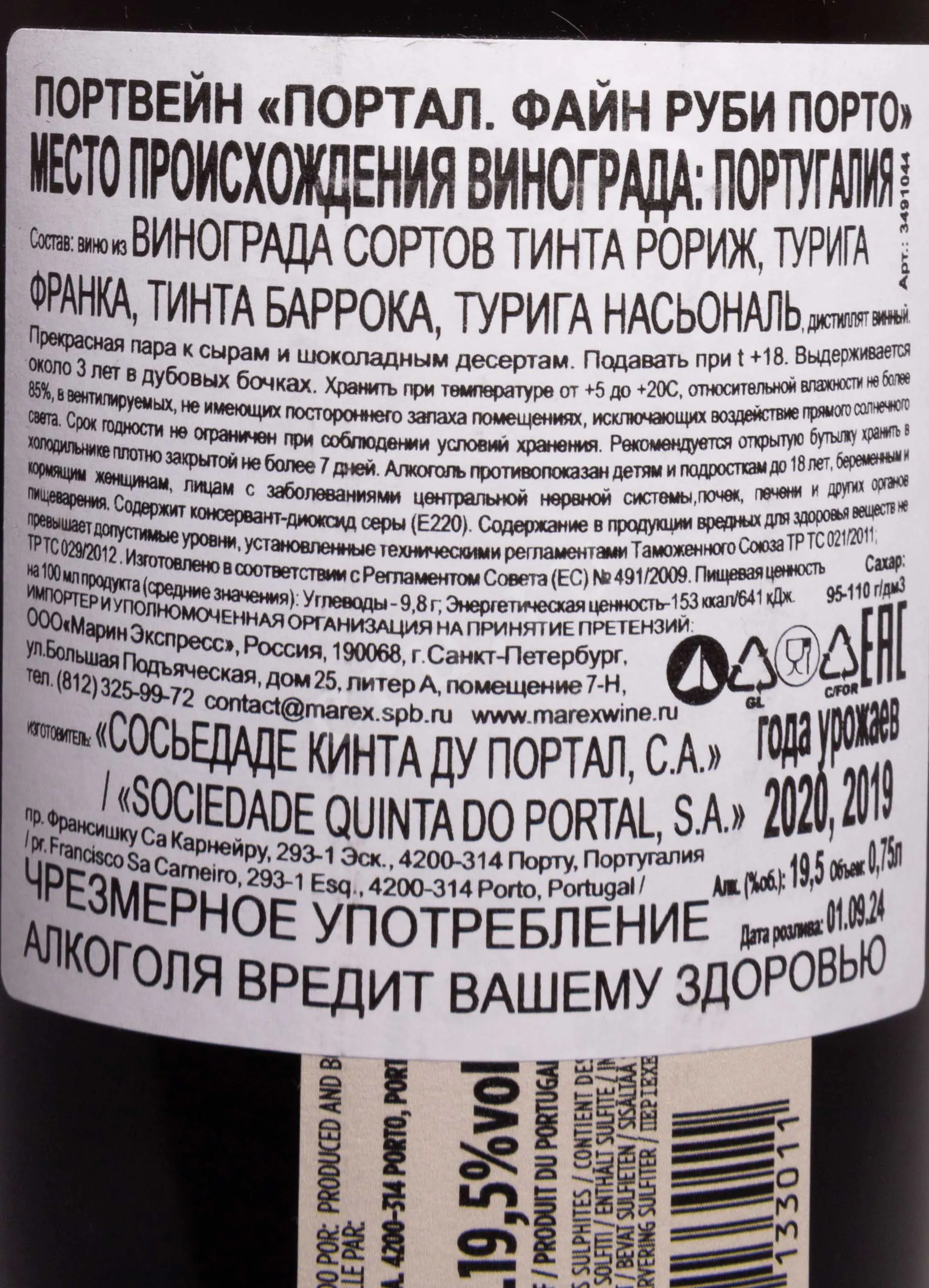 Портвейн Portal Fine Ruby — красное сладкое креплёное португальское вино из Долины Дору. Лозы, виноград которых используют для производства напитка произрастают в разных местах. Это обеспечивает многообразие характеристик винограда. Сбор урожая осуществлялся вручную в сентябре-октябре. Ягоды отделяют от гребней и дробят. Далее производится теплая ферментация и мацерация при контролируемой температуре в стальных чанах. Выдерживается порто как в чанах, так и в бочках 3 года.