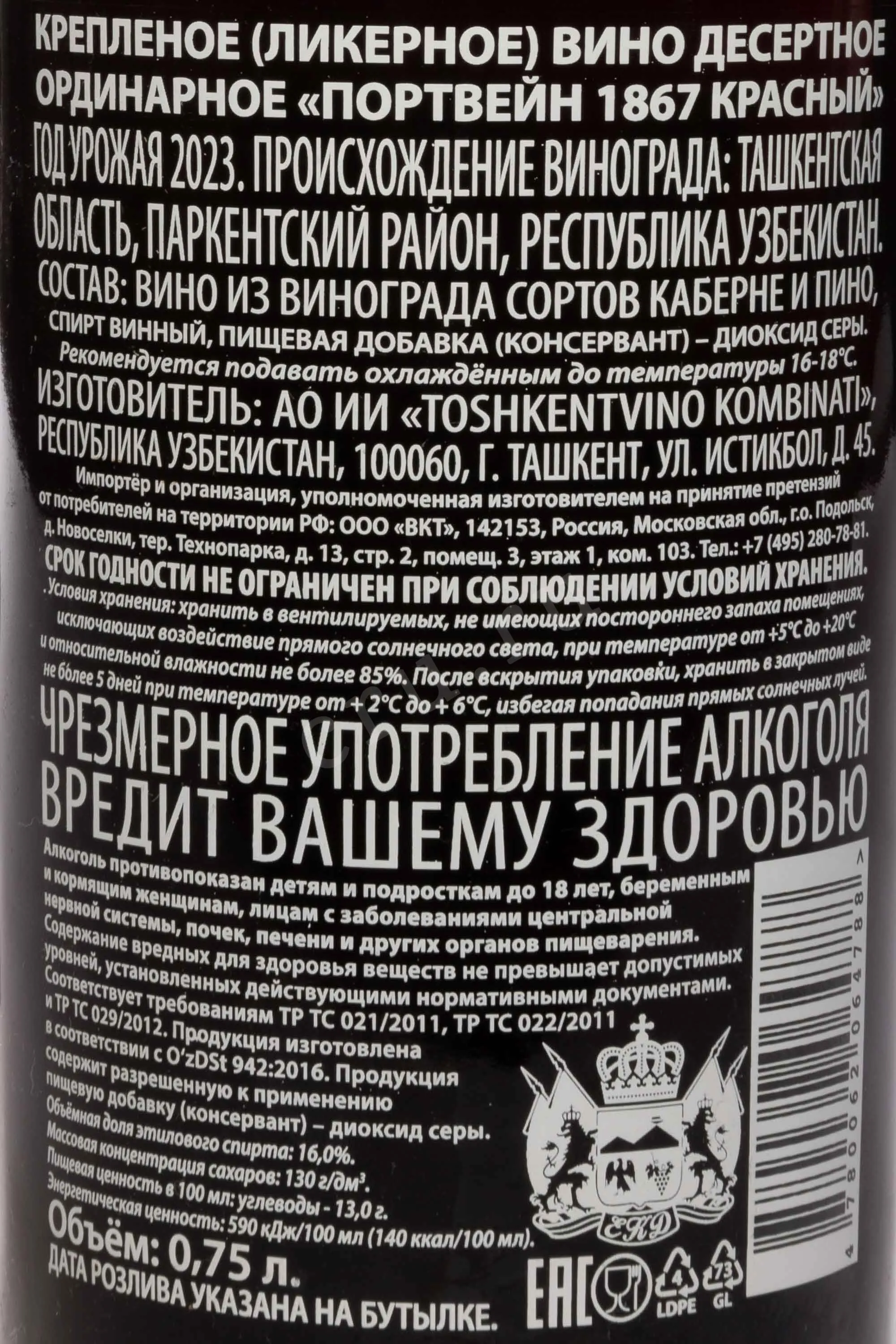 Портвейн Porto 1867 Ruby 2022 0.75 л был создан по традиционной технологии, предусматривающей поздний сбор тщательно отобранных ягод и их естественное брожение с последующим добавлением виноградного спирта. Урожай собирали на виноградниках, расположенных в долине реки Зарафшан, где солнечный климат, песчано-каменистые почвы и перепады дневных и ночных температур способствовали накоплению сахаров и созданию глубокого, насыщенного аромата.
