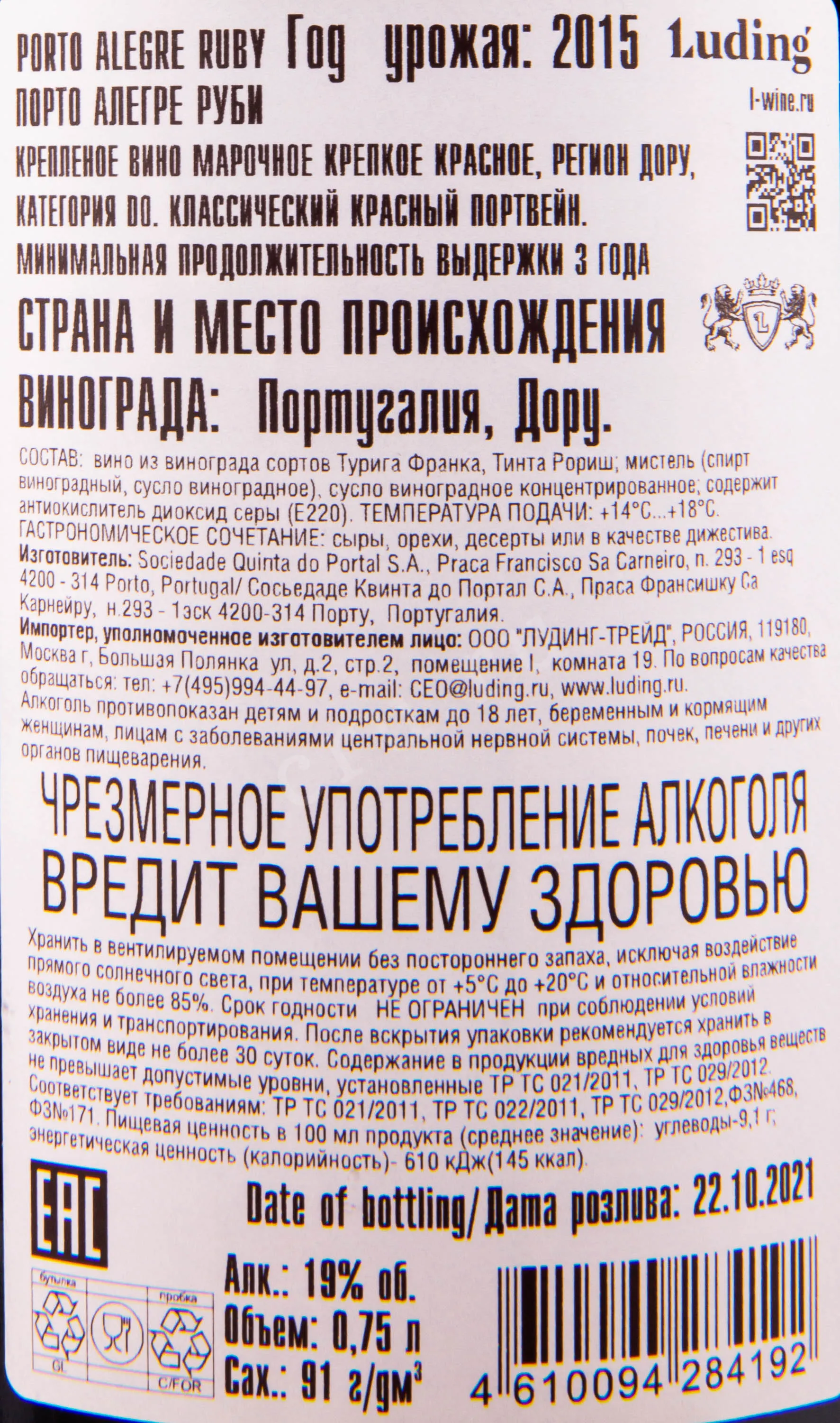 - Сорта винограда: Турига Франка, Тинта Рориз.