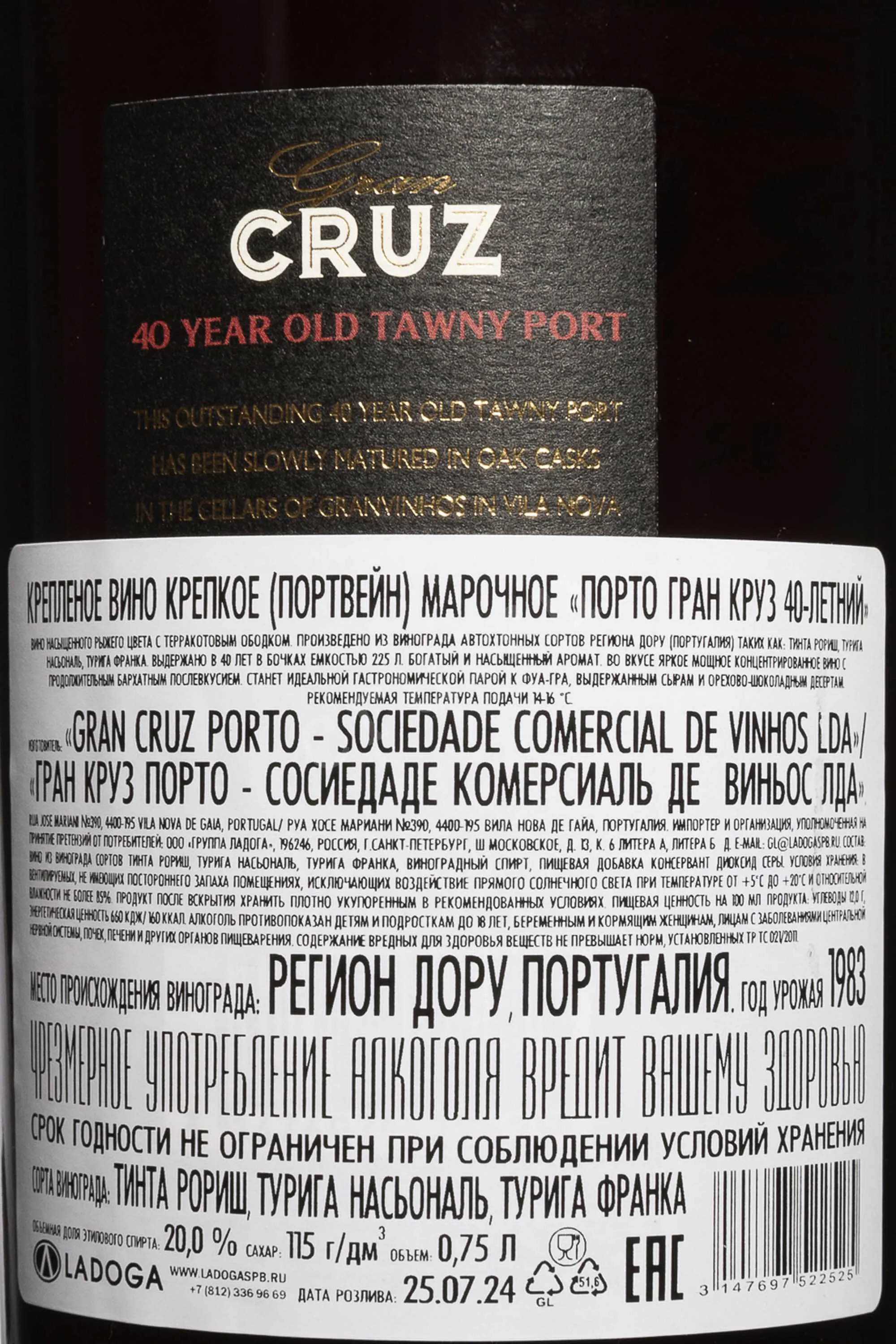 Портвейн Porto Gran Cruz 40 лет 1983 г. 0,75 л в деревянноой коробке — выдающийся выдержанный Tawny, созданный как итог многолетней селекции и терпеливого созревания. Для этого напитка используют ягоды красных португальских автохтонов, собранные в долине Дору на террасных виноградниках с жарким климатом и сланцевыми почвами. Сырьё традиционно давят ногами в гранитных лагарах для мягкой экстракции танинов и цвета. После продолжительной мацерации следует ферментация при контролируемых температурах. В момент достижения нужного уровня сладости добавляется винный спирт Aguardente, останавливающий брожение и фиксирующий баланс. Купаж создаётся путем смешивания лучших партий портвейна, выдержанных в дубовых чанах. Средний возраст вин в ассамбляже составляет около сорока лет, что определяет сложный, зрелый и гармоничный стиль. Долгое окислительное развитие формирует благородную глубину и редкую элегантность, характерную для старых Tawny. Подарочная упаковка подчёркивает статус напитка и его коллекционное значение.