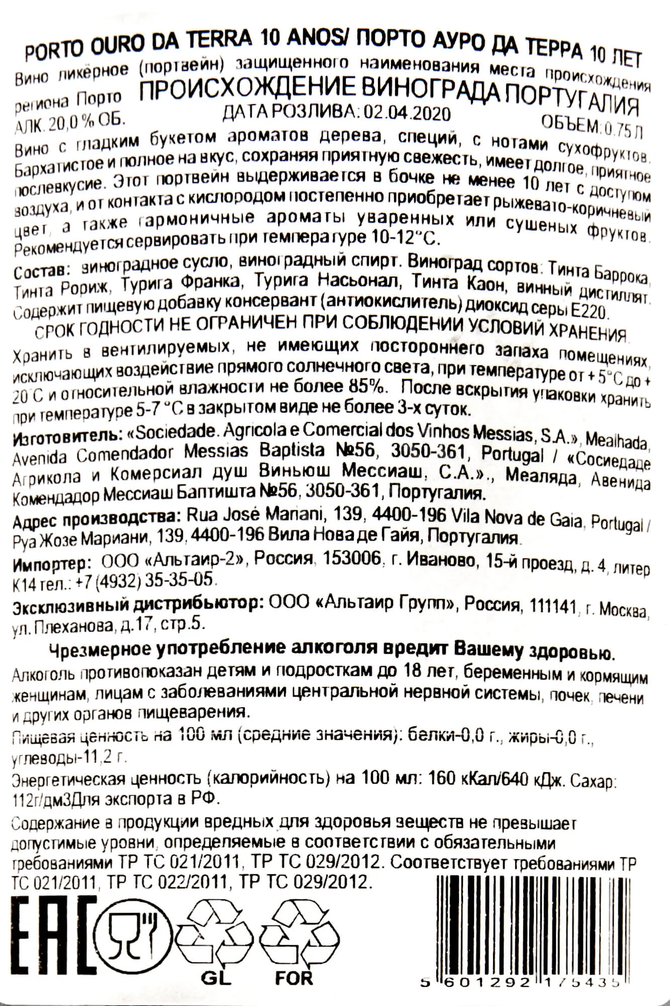 Porto Ouro da Terra 10 anos 2013 0.75 л купить - Портвейн Порто Ауро Да Терра 10 лет цена в магазинег. Москва, ул. Профсоюзная, д. 16/1010:00-22:00 Ежедневно+7 (495) 920-20-02info@cru.ru