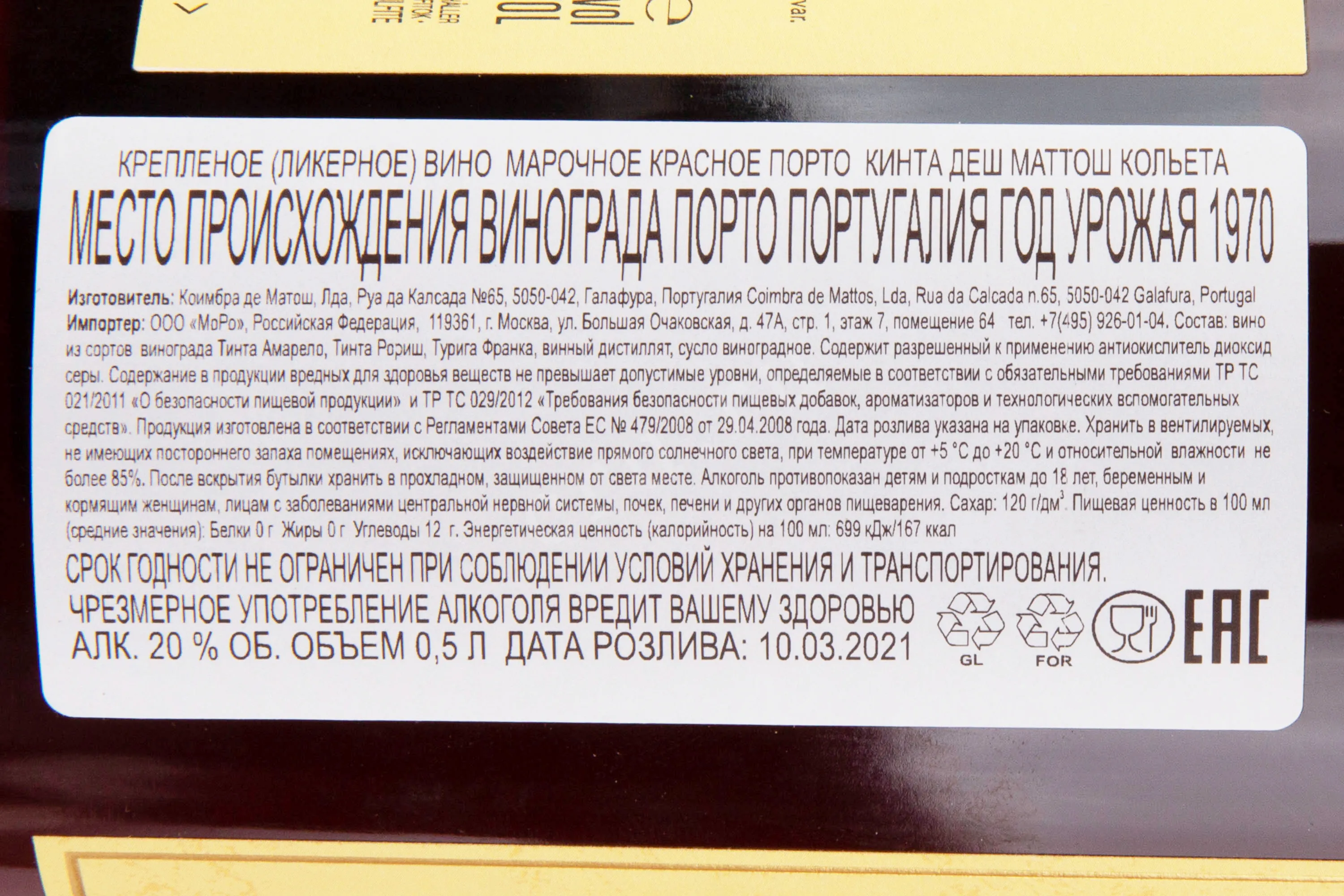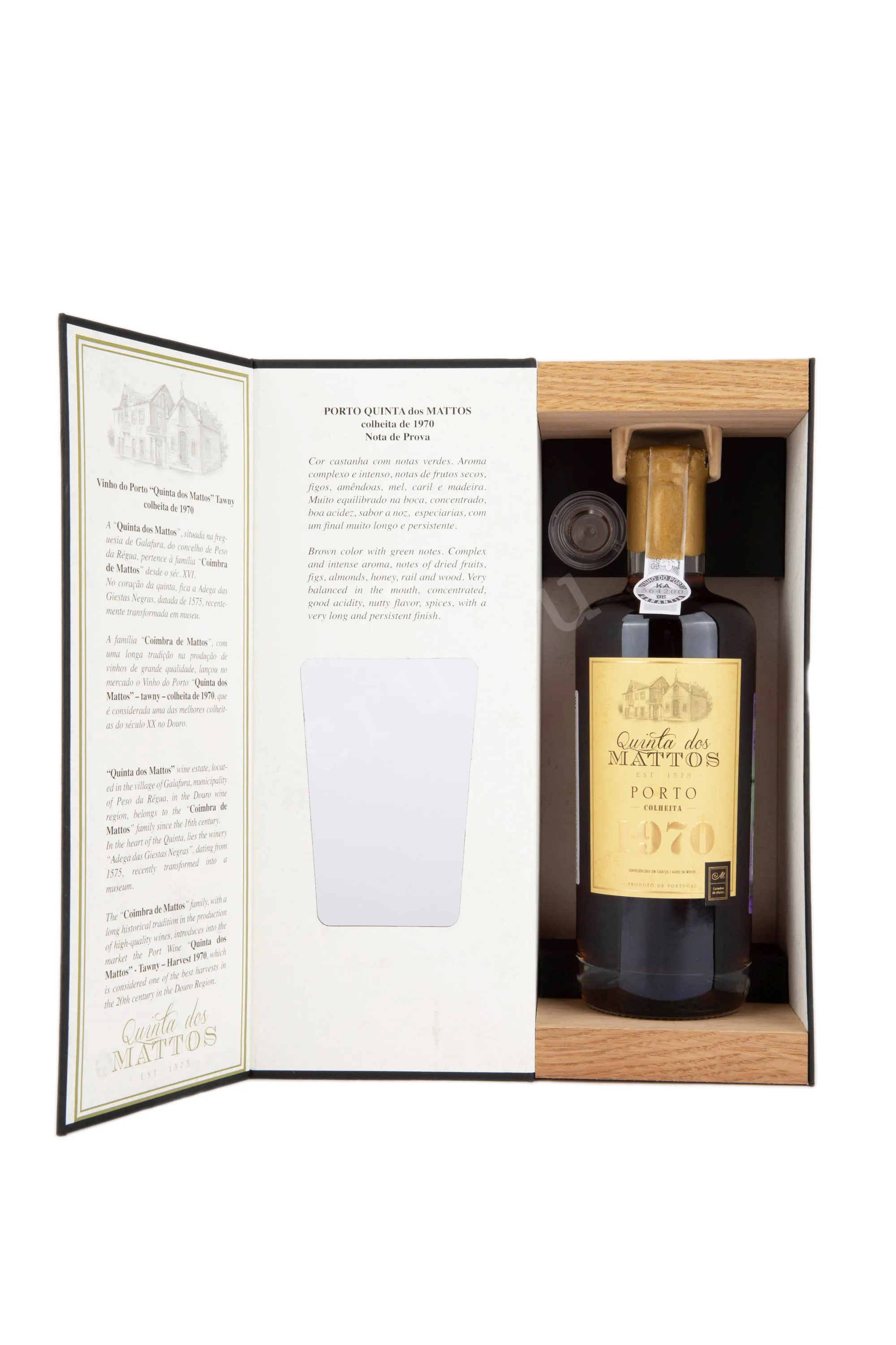 Портвейн Porto Quinta dos Mattos Colheita 1970 года 0,5 л производится в регионе Дору винодельней Coimbra de Mattos. Виноград собирается вручную, отбираются только зрелые, здоровые и целые ягоды. Ферментация проходит в традиционных каменных чанах (лагарах) с утаптыванием ногами, что обеспечивает мягкое извлечение цвета и танинов. Ферментация прерывается добавлением виноградного спирта, что позволяет сохранить натуральную сладость. Вино выдерживается в дубовых бочках не менее 7 лет, что придает ему сложность и гармонию вкуса. Портвейн отражает уникальный терруар долины Дору и особенности урожая 1970 года, поэтому является особенно ценным коллекционным винтажом.