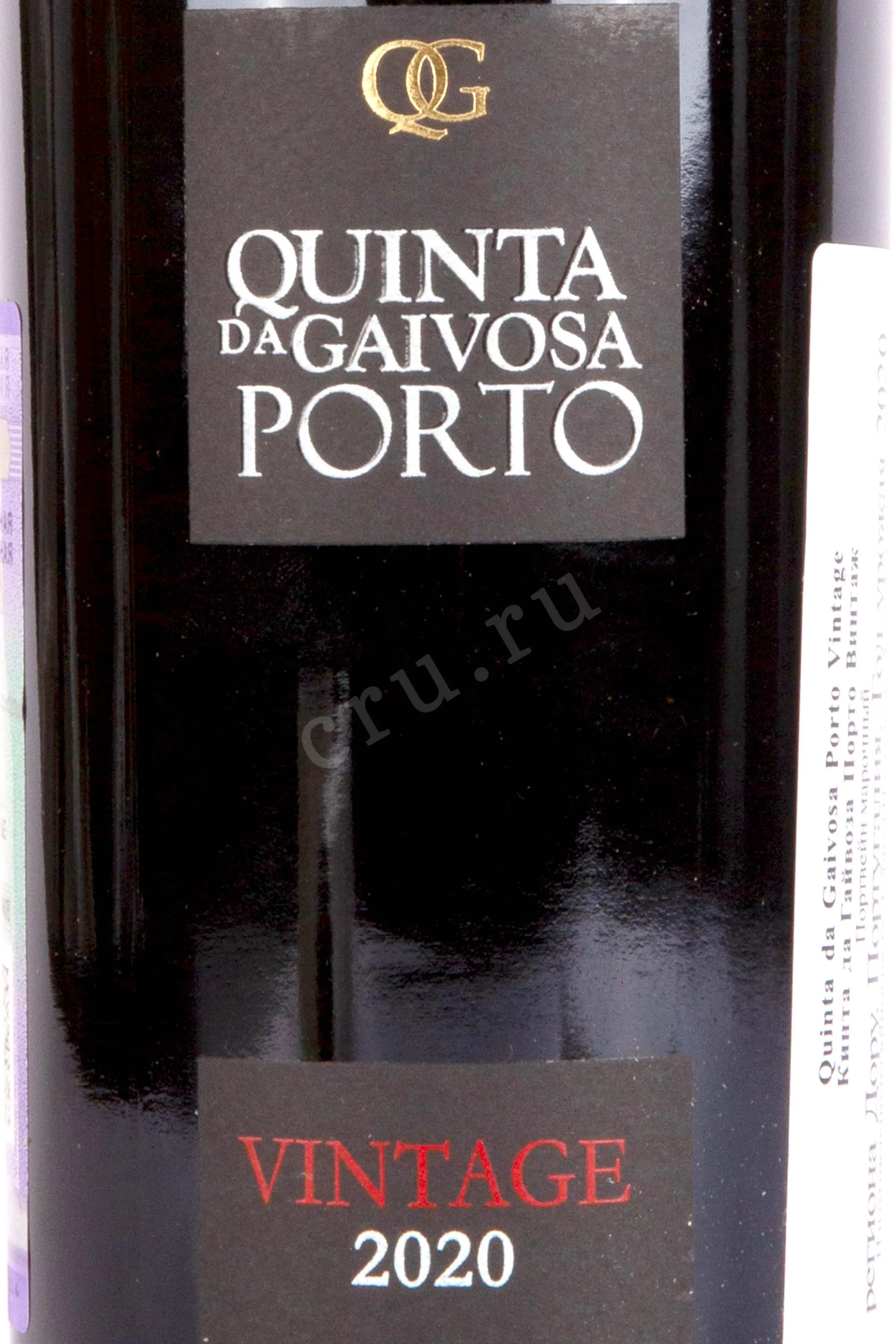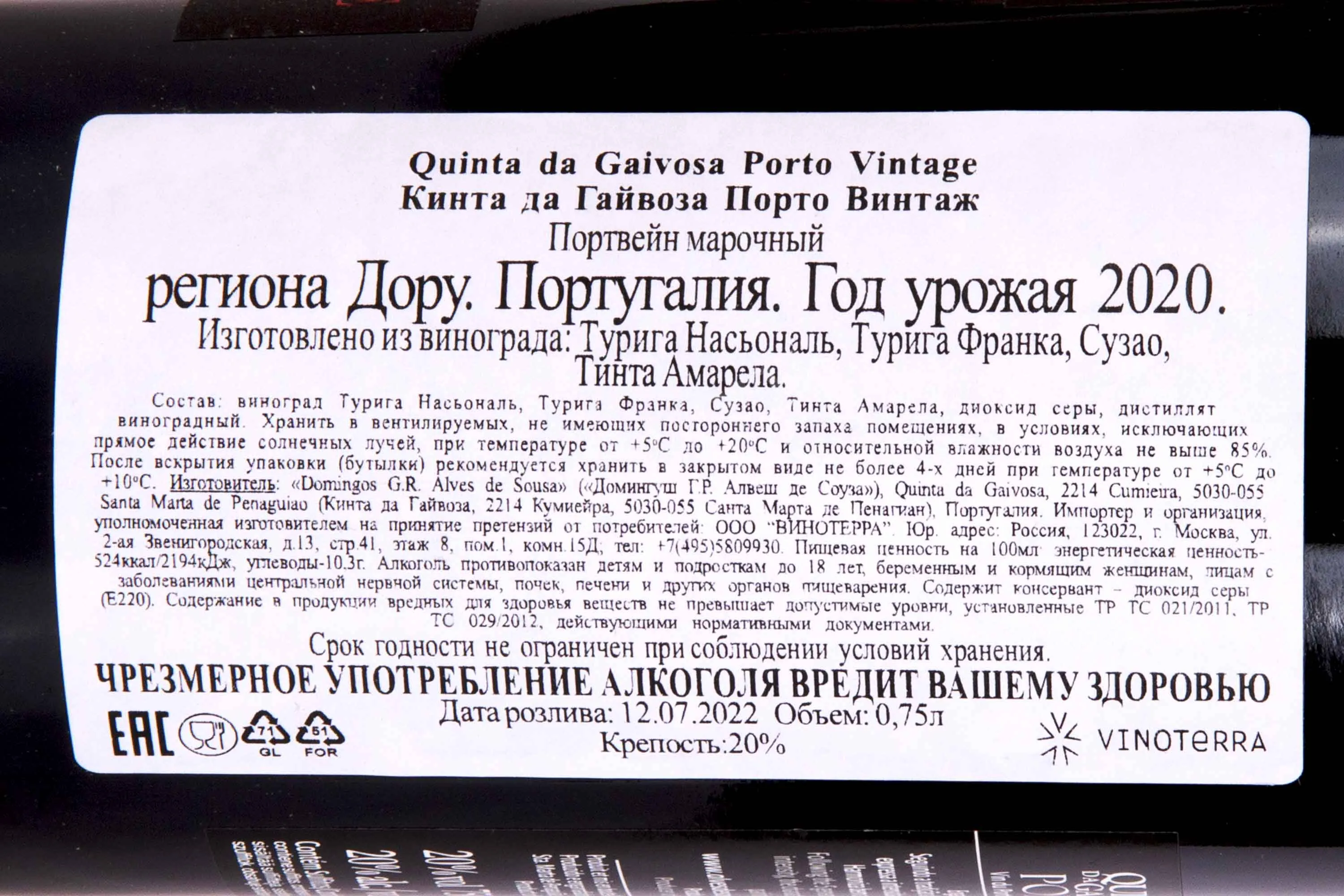 Портвейн Quinta da Gaivosa Porto Vintage 2020 г. 0,75 л — образец португальского виноделия с виноградников хозяйства Quinta da Gaivosa в регионе Дору. Терруар характеризуется гранитными почвами, крутыми склонами, резкими температурными перепадами днем и ночью, что придает напитку сложную структуру. Год урожая отличался ранней и теплой весной, после которой наступило жаркое и крайне засушливое лето, обеспечившее ягоды с высоким уровнем сахара и превосходной зрелостью. Сырье ферментируется при температуре около 17 °C, затем процесс останавливают добавлением виноградного спирта (77%), сохраняющего естественную сладость и ароматические свойства. Далее вино выдерживается около двух лет в больших емкостях и дозревает в бутылках. Общий объем производства — 24 000 бутылок. Напиток получил высокие оценки экспертов и частных дегустаторов (93-95 баллов), рекомендуемый период употребления — с 2030 по 2050 годы.