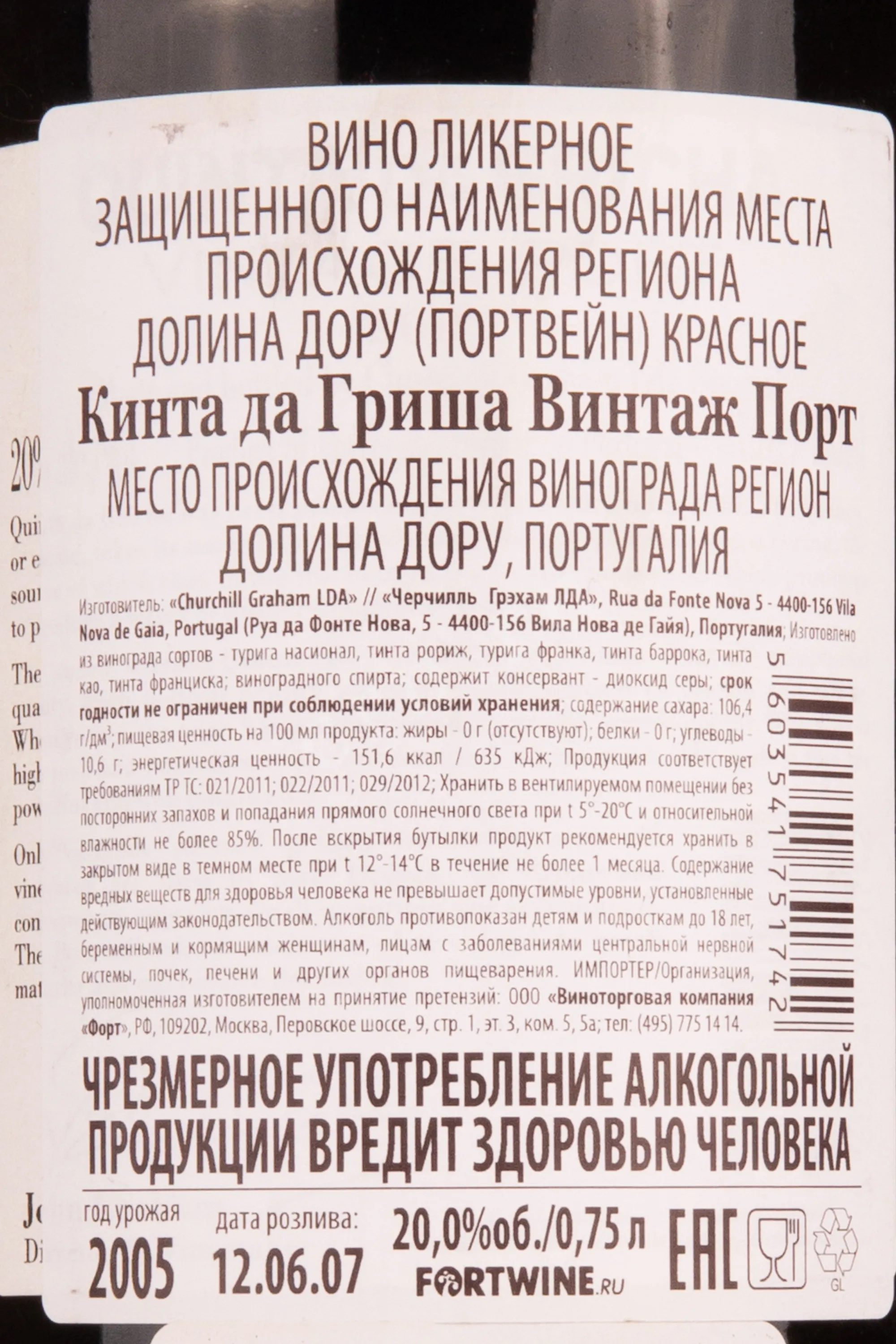 Портвейн Quinta da Gricha Vintage 2005 г. 0.75 l – это элегантный португальский винтаж, который относится к категории single quinta. Изготовлен 20-процентный напиток из ягод, собранных в 2005 году исключительно со старых лоз. Выдержка сладкого порто протекает в дубовых бочках в течение 4-х лет и имеет потенциал хранения более 30 лет.