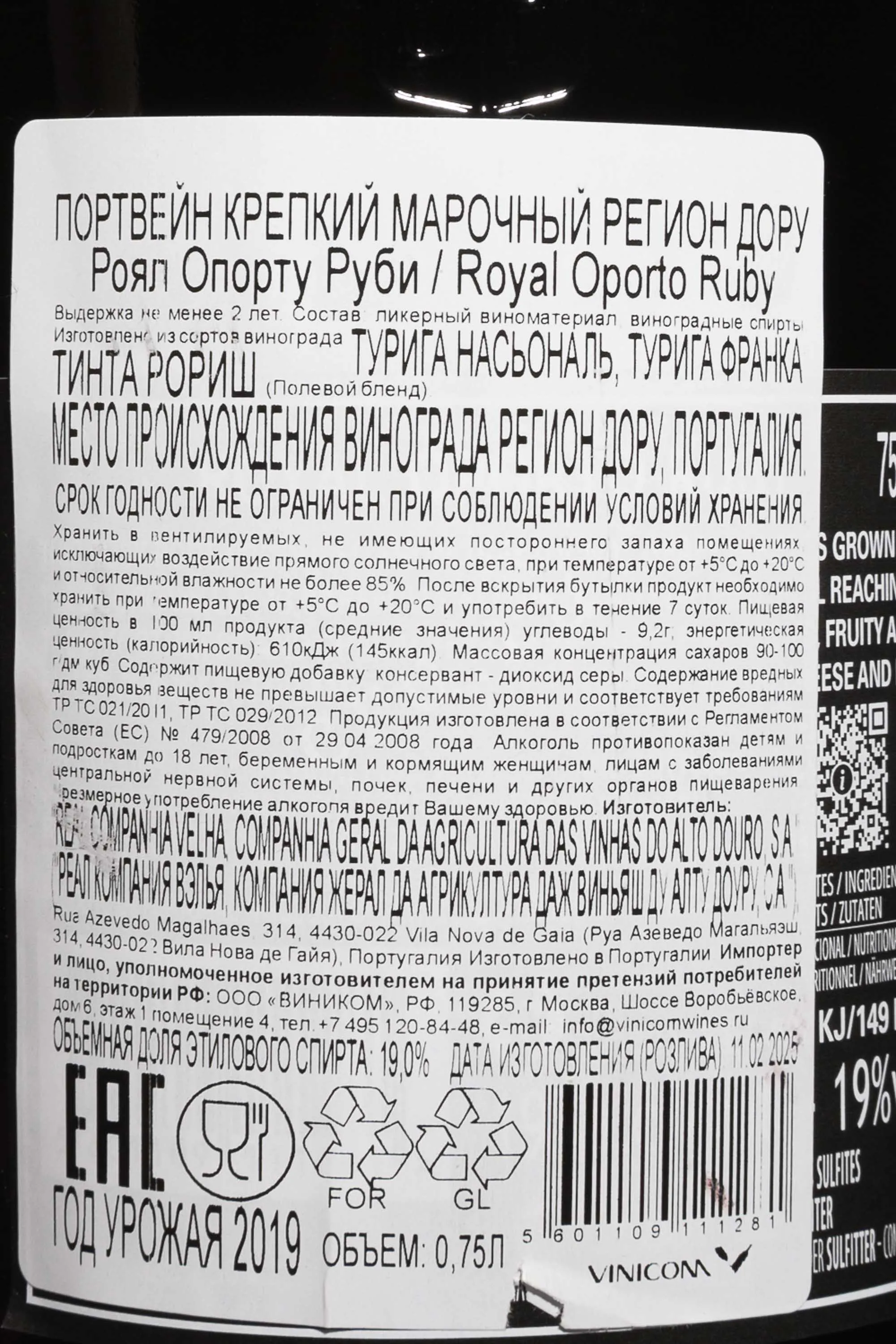 Портвейн Royal Oporto Ruby 0.75 l состоит из купажа отборных порто разных возрастов, изготовленных из красных сортов винограда Долины Дору. 19-процентное крепленое вино выдерживается в старых дубовых бочках на протяжении двух лет.