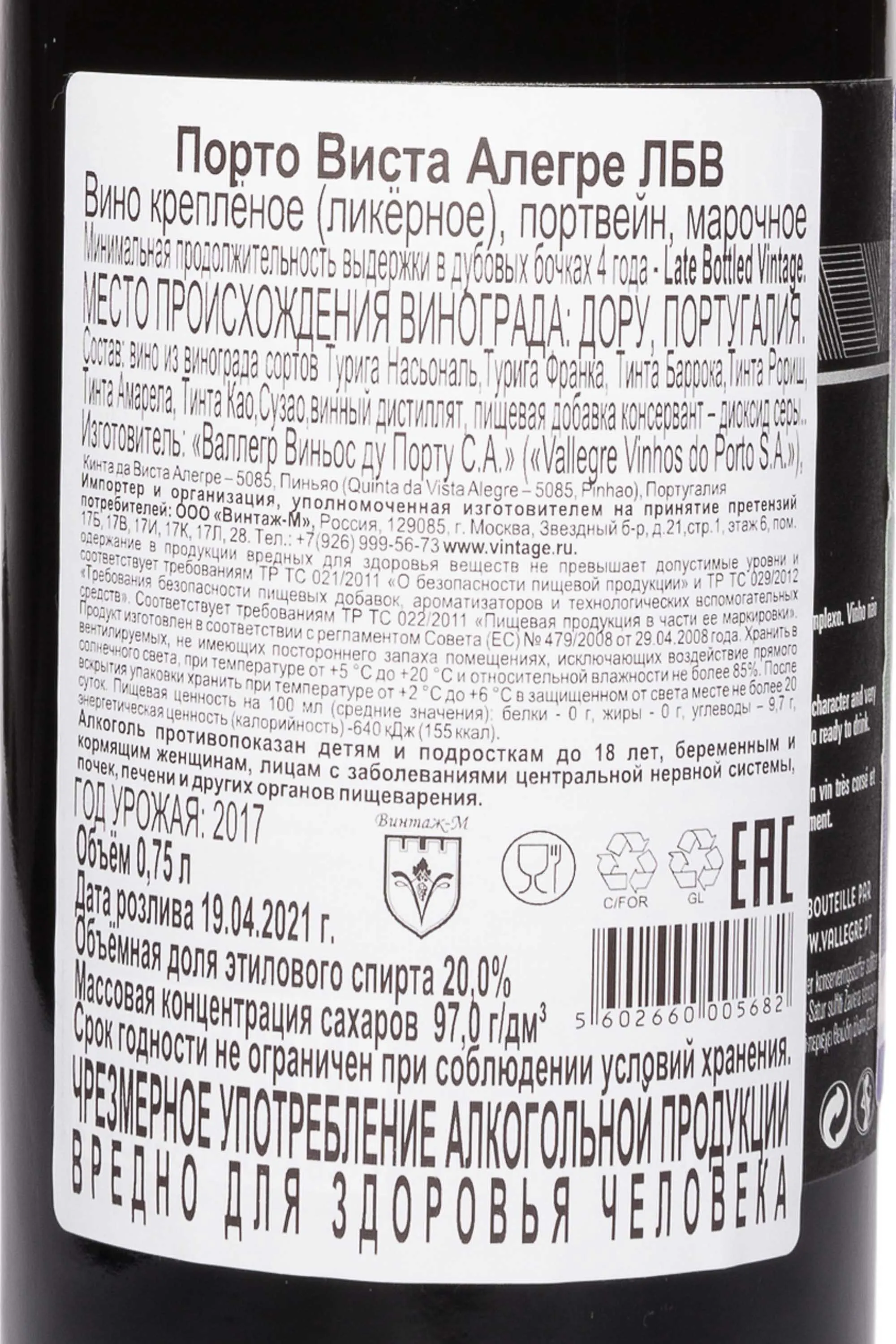 Портвейн Vista Alegre LBV 2017 года 0,75 л — насыщенный и зрелый, с выразительным характером долины Дору. Виноград был выращен на старинных террасах поместья Виста Алегре, где лозы старше 80 лет дают ограниченные урожаи ягод с концентрированным вкусом. Южная экспозиция склонов обеспечивает оптимальное созревание. 2017 год отличился стабильной погодой и стал одним из лучших для виноделов региона. Урожай собирали вручную. Винификация проходила по классическому методу. Брожение прерывали путем добавления винного спирта. Выдержка длилась не менее 4 лет в больших дубовых чанах, розлив осуществлялся без фильтрации и холодной стабилизации. Этот портвейн отмечен медалями на конкурсах Concours Mondial de Bruxelles и Mundus Vini, что подчеркивает его выдающееся качество.