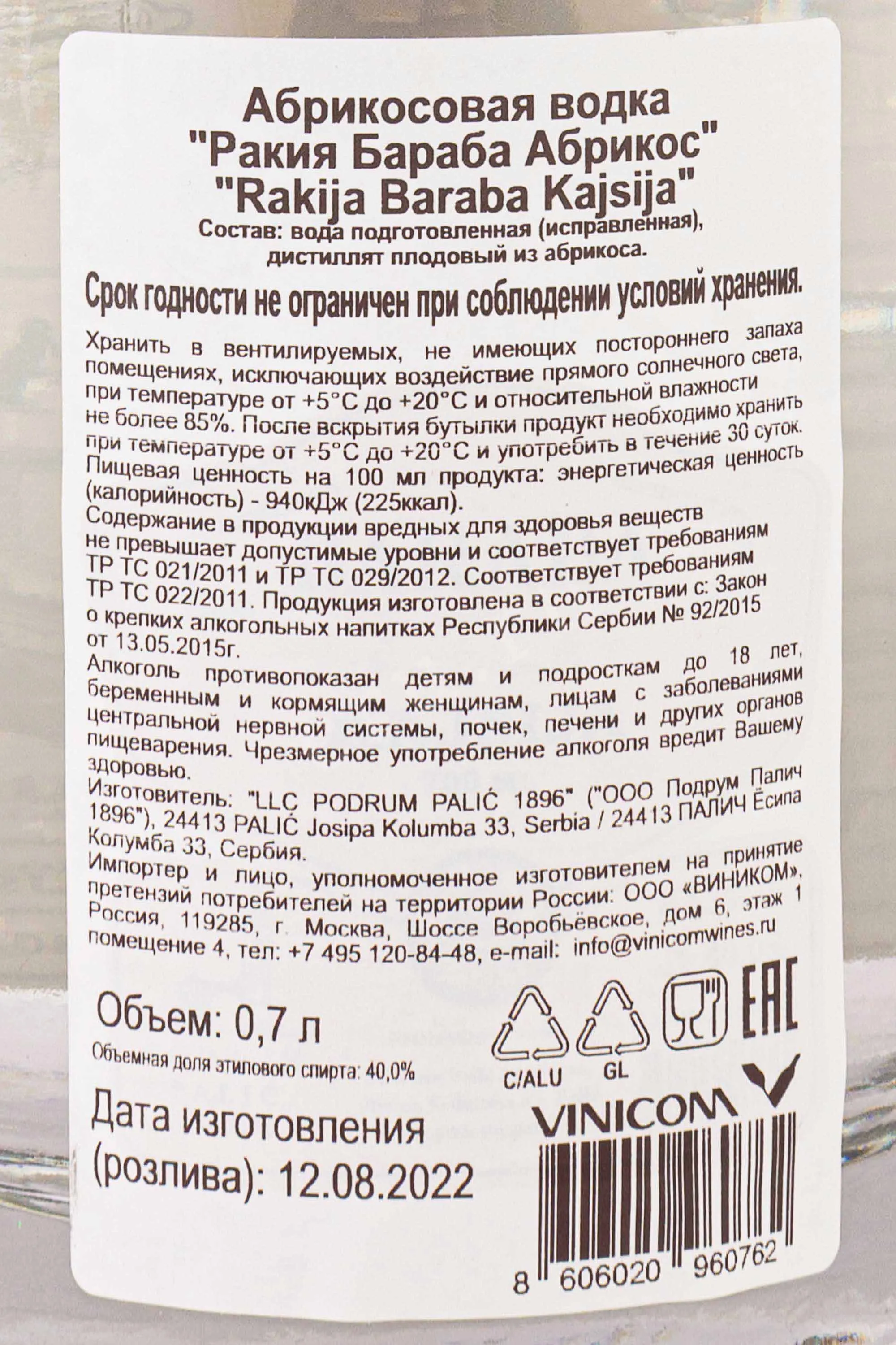 Ракия Baraba Kajsija 0,7 л — это сербский крепкий напиток, изготовленный из отборных абрикосов. Производство расположено в районе Палич-Суботица в собственных садах компании Podrum Palić. Для напитка выбираются только самые спелые плоды, сбор которых производится вручную. Затем сырьё подвергается брожению при контролируемой температуре от 15 до 18 °С в ёмкостях из нержавеющей стали. Дистилляция проходит в традиционных медных аламбиках. Это позволяет сохранить натуральную фруктовость и исключить грубость спиртовых акцентов. При изготовлении не используются сахар и искусственные добавки. Бренди получил высшие награды международного конкурса IWSC в 2023 и 2024 годах с оценкой 95 баллов.