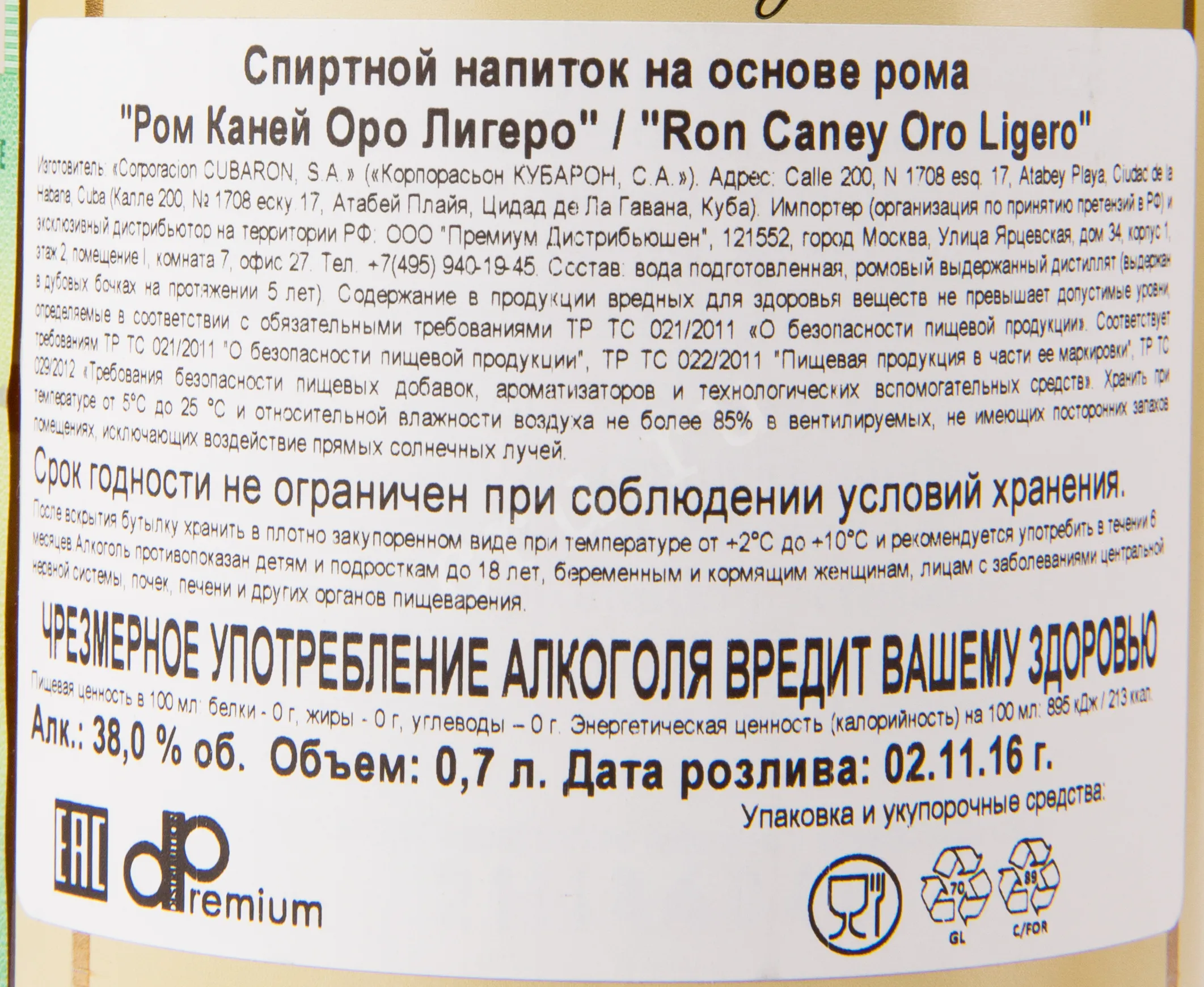 Ром Caney Oro Ligero 5 years 0.7 l – это традиционный кубинский алкоголь премиального класса, изготовленный из сахарного тростника. Название пиратского напитка переводится как «золотой свет», что полностью отражает его цвет. Выдержка 38-процентного рома протекает в дубовых бочках не менее 5 лет.