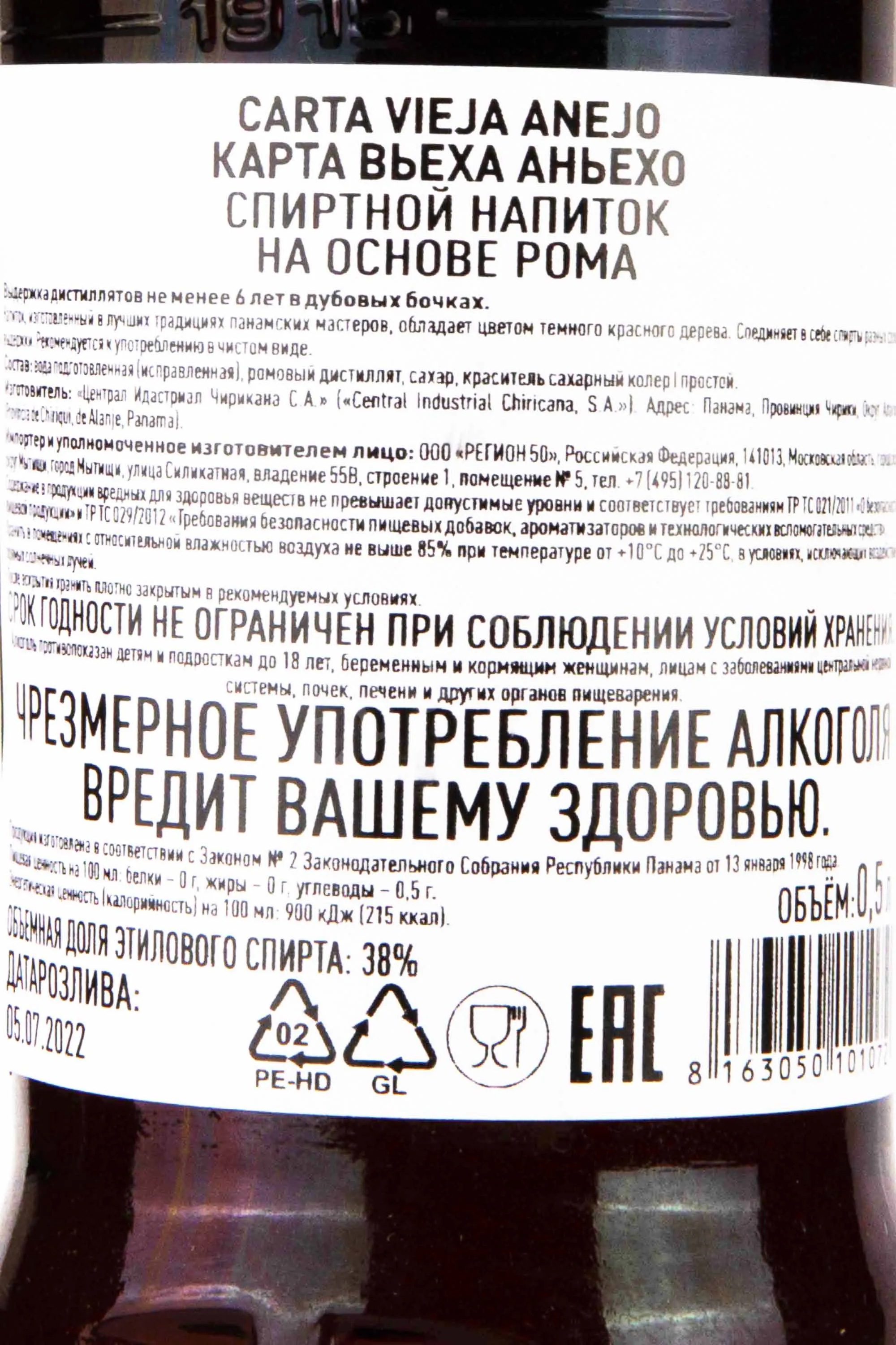 Ром Carta Vieja Anejo 0.5 l – это премиальный темный ром, который представляет собой купаж разных спиртов, самый молодой из которых вызревал 6 лет. 38-процентный rum выдерживается в новых барриках из американского белого дуба.