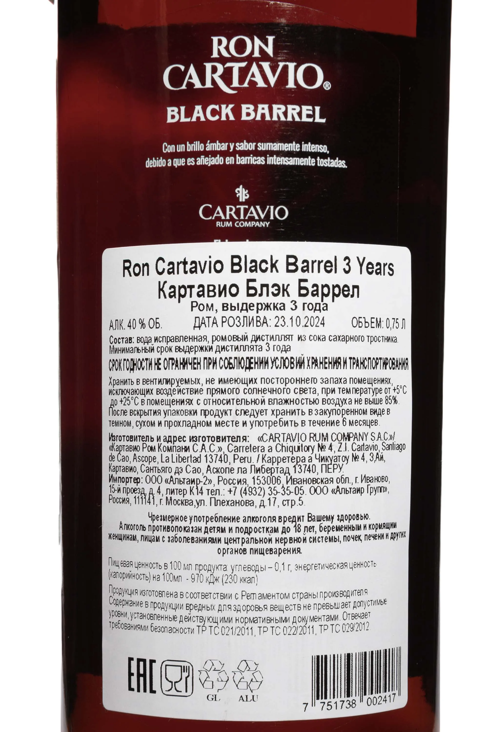 Ром Cartavio Black Barrel 3 года 0.75 л создан в Перу и относится к тёмным сортам с выразительным характером. Напиток производят из патоки местного тростника. Дистилляция проходит на вакуумной колонне, что помогает сохранить мягкость и чистый профиль спиртов. Выдержка длится три года в бочках из-под бурбона с сильным обжигом. Такой подход формирует глубокие оттенки ванили, карамели и обожжённого дуба. Ром получил высокие оценки на международных конкурсах, включая двойную золотую медаль, что подтверждает его устойчивую репутацию среди экспертов.