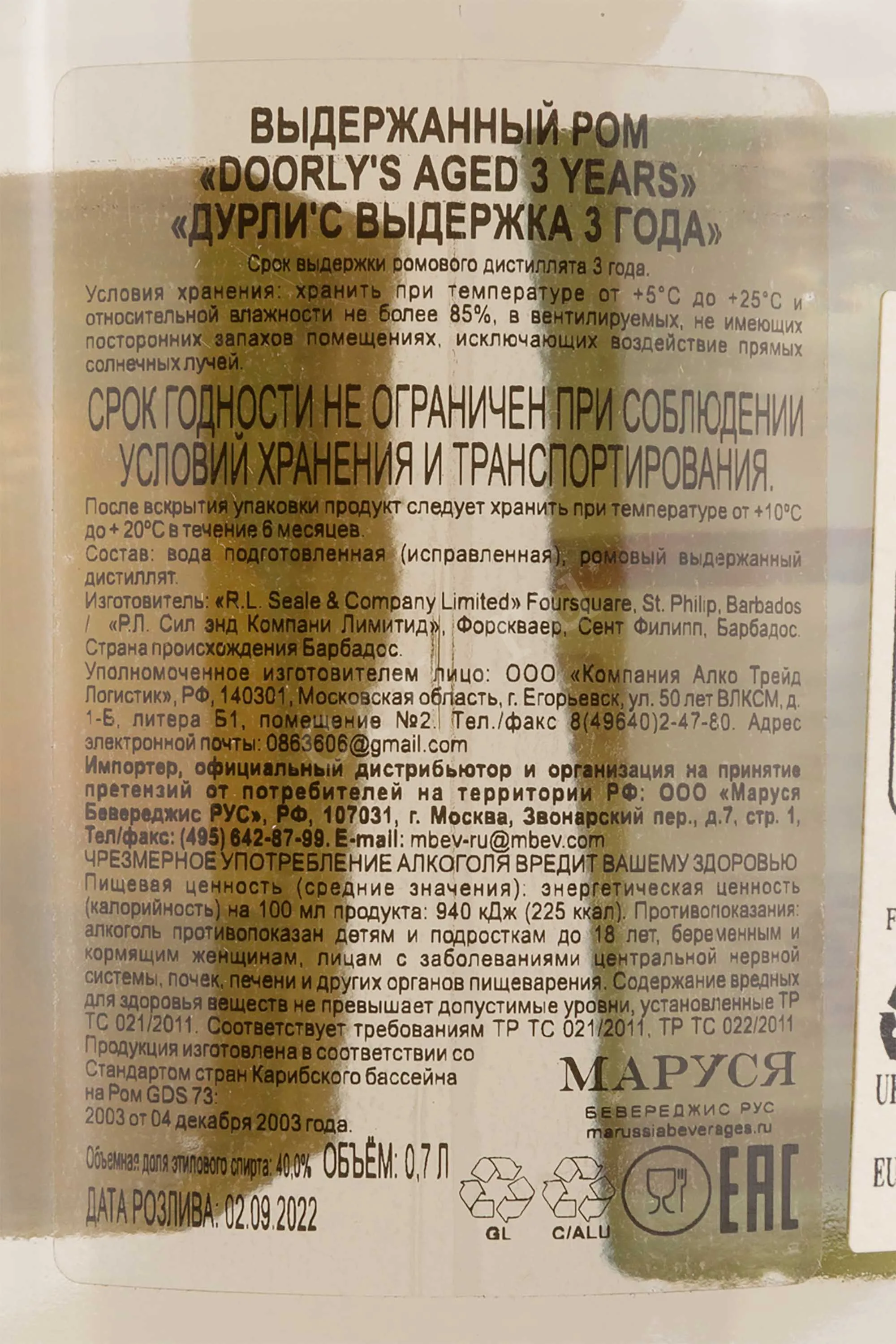 Ром Doorly`s 3 years 0.7 l – это классический белый алкоголь от барбадосской компании RL Seale and Company Ltd. Напиток имеет крепость 40% и представляет собой бленд спиртов, выдержанных не менее трех лет в бочках, изготовленных вручную из белого американского дуба. Благодаря своему исключительному качеству, rum был награжден золотой медалью на дегустационном конкурсе в Лондоне.