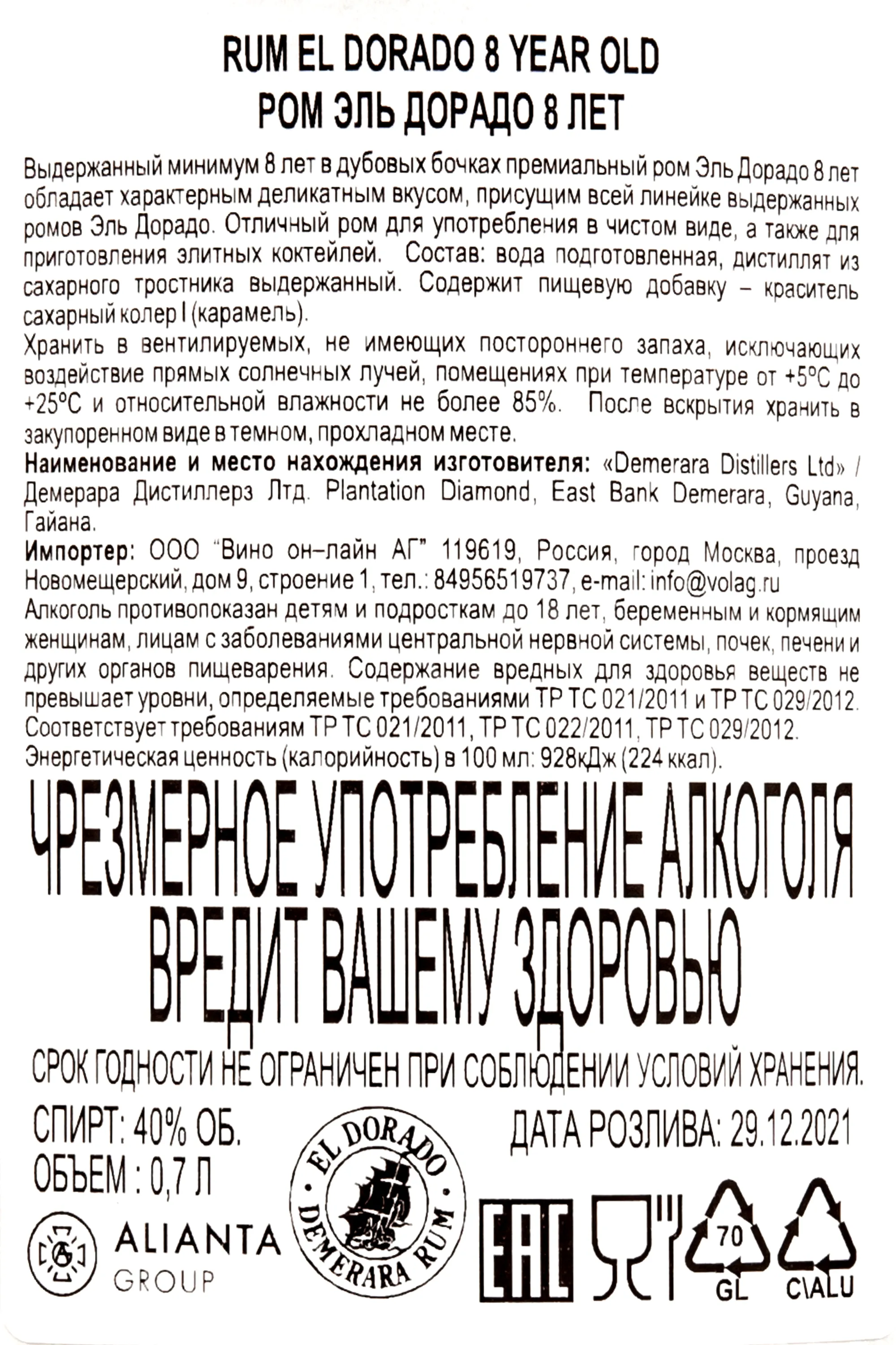 El Dorado 8 years 0.7 л купить - Ром Эль Дорадо 8 лет цена в магазинег. Москва, ул. Профсоюзная, д. 16/1010:00-22:00 Ежедневно+7 (495) 920-20-02info@cru.ru