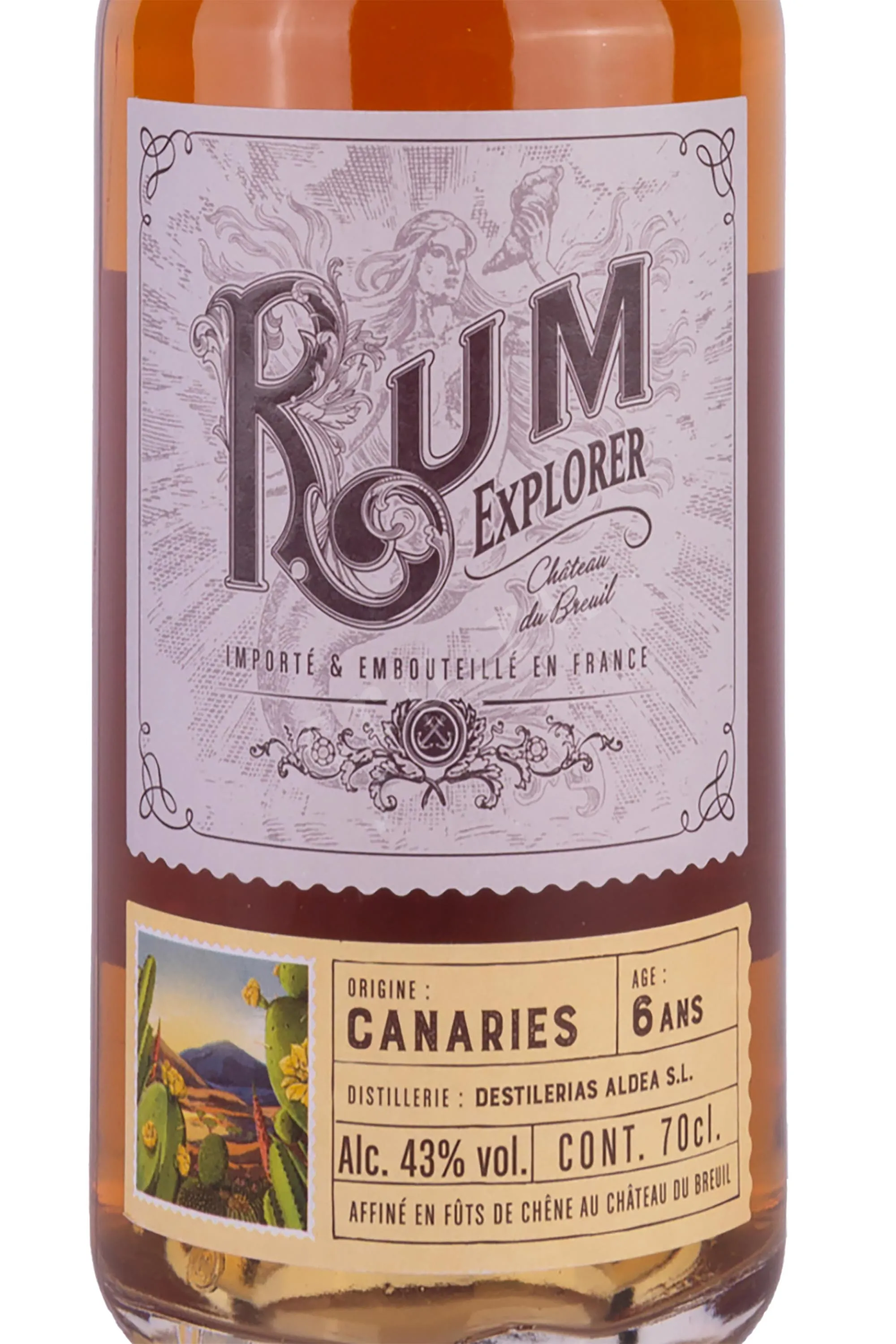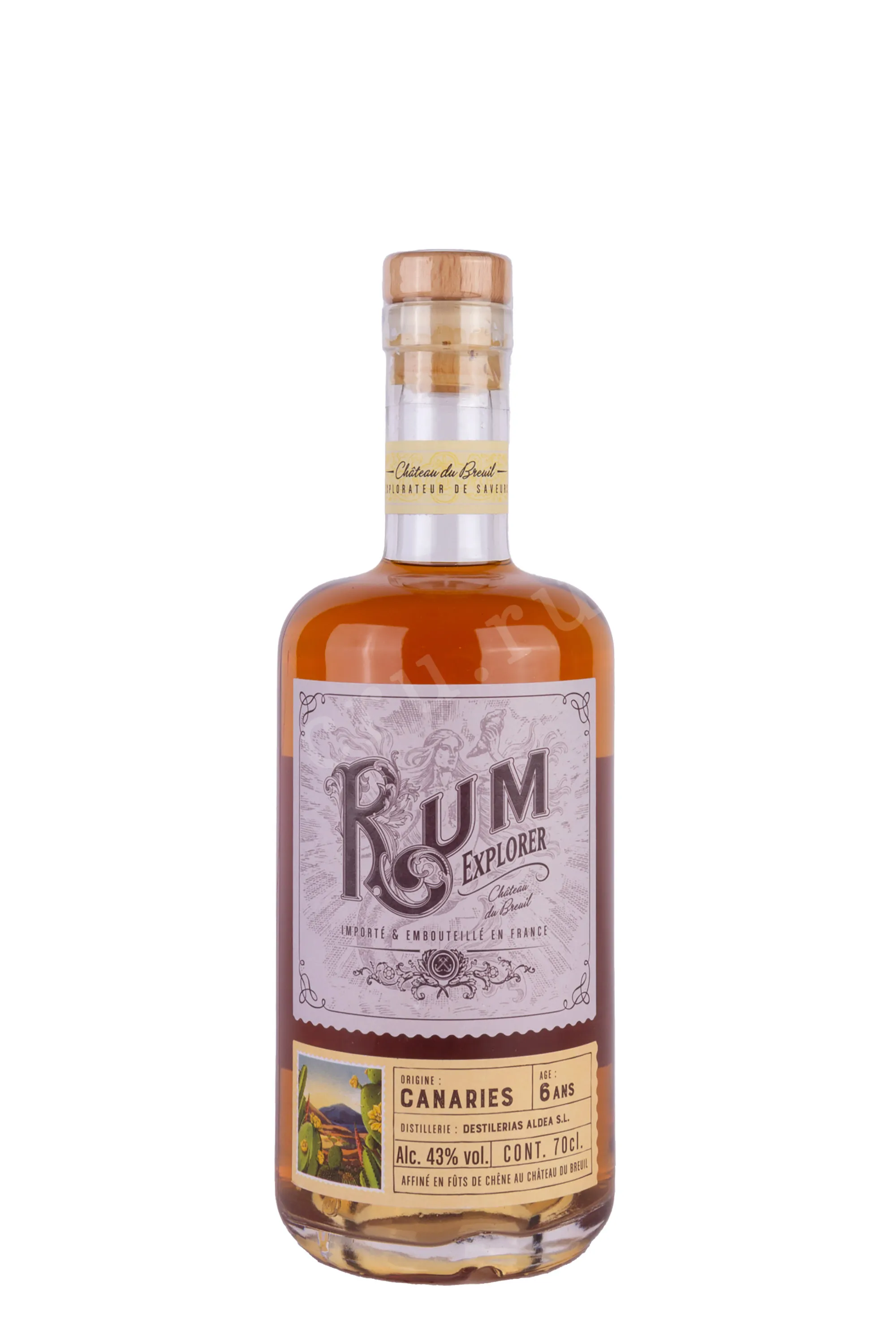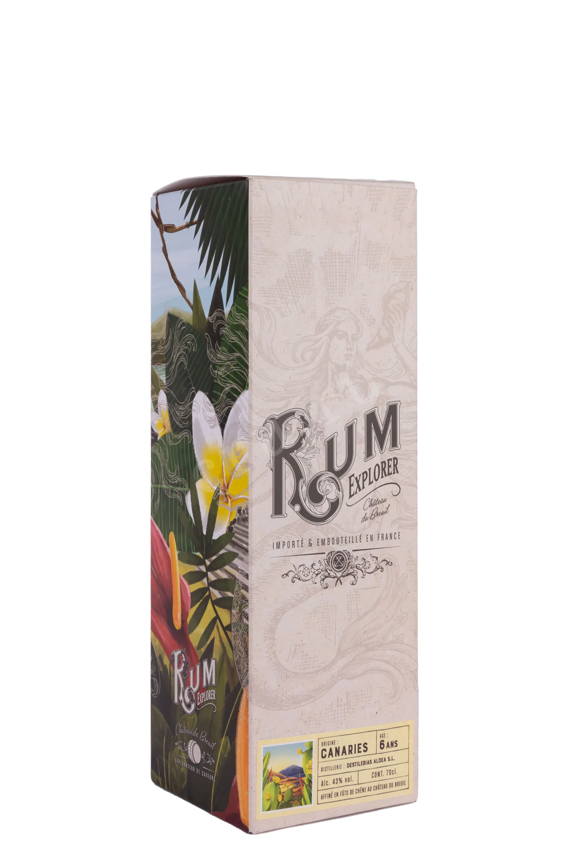 Ром Explorer Canaries 6 years old gift box 0,7 л — 43-градусный французский напиток, который обладает шестилетним сроком выдержки в бочонках из цельной древесины американского дуба. Полный цикл производства алкоголя осуществился на заводе компании из региона Нормандия: спелый сахарный тростник с Канарских островов ферментировался и дистиллировался в перегонных кубах, после чего настал черед выдержки в помещениях с особым микроклиматом. Ром в классических бутылках укомплектован стильным картонными коробками с оригинальным декором боковых граней: на них изображен принт в виде рисунка тропической флоры.
