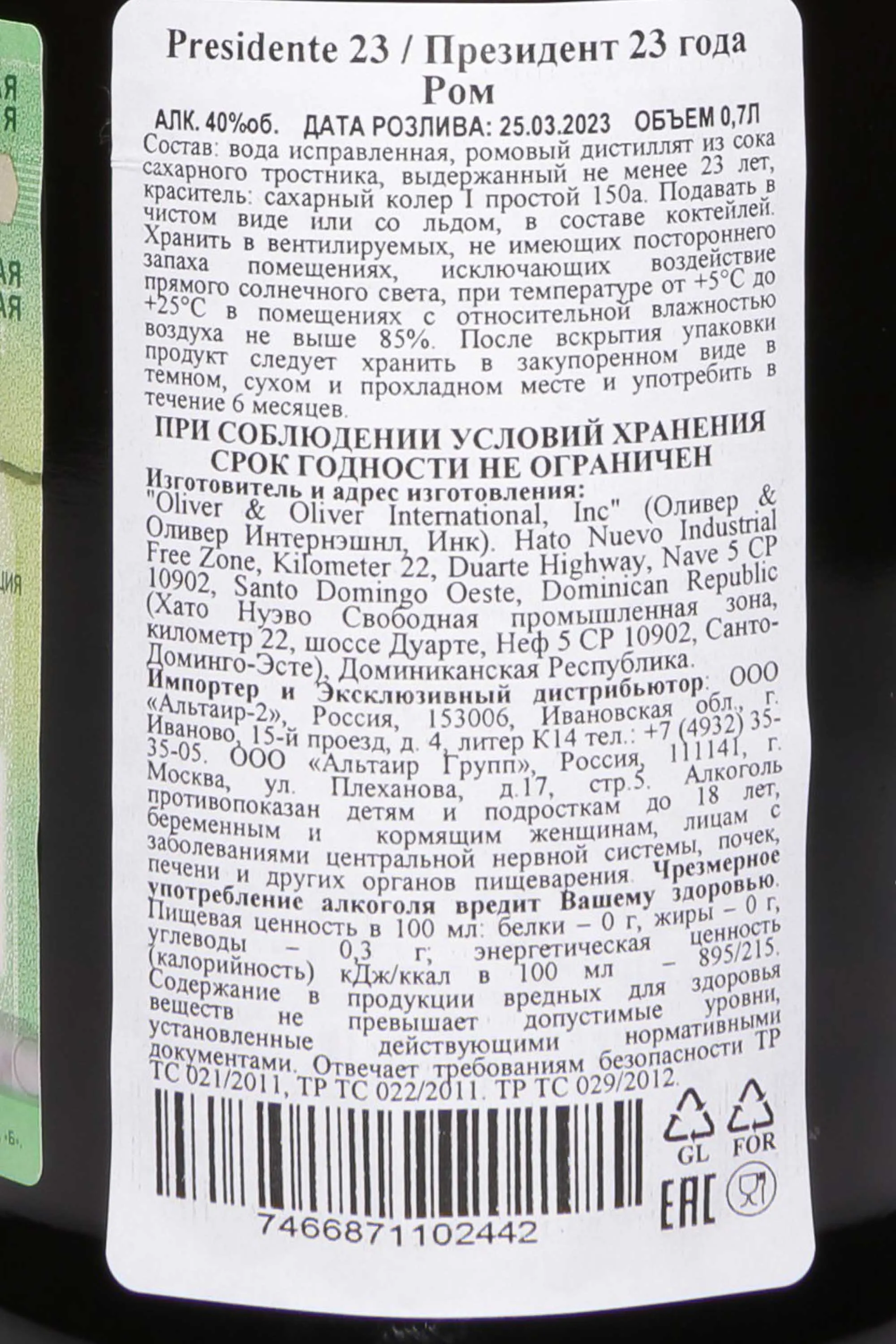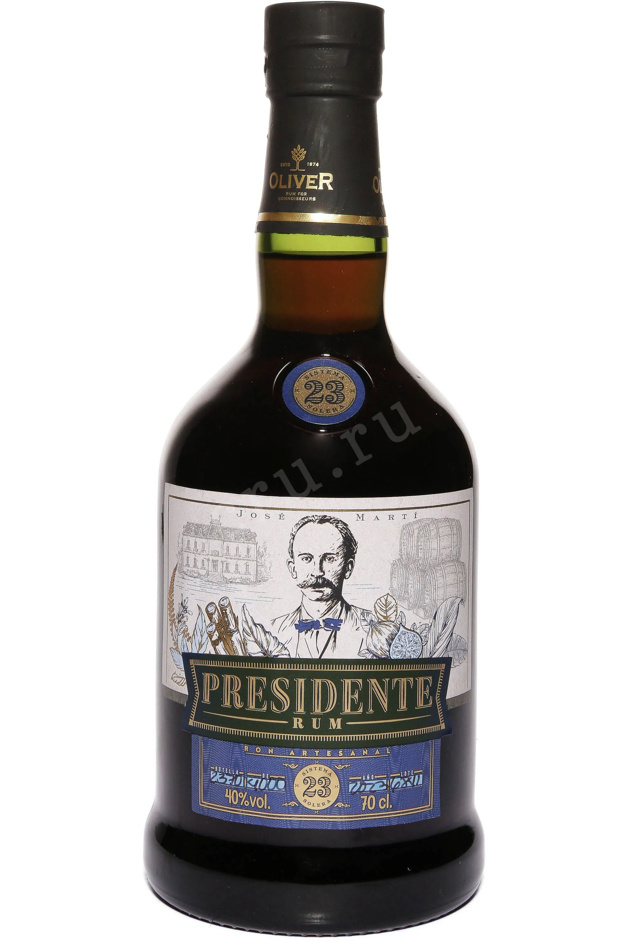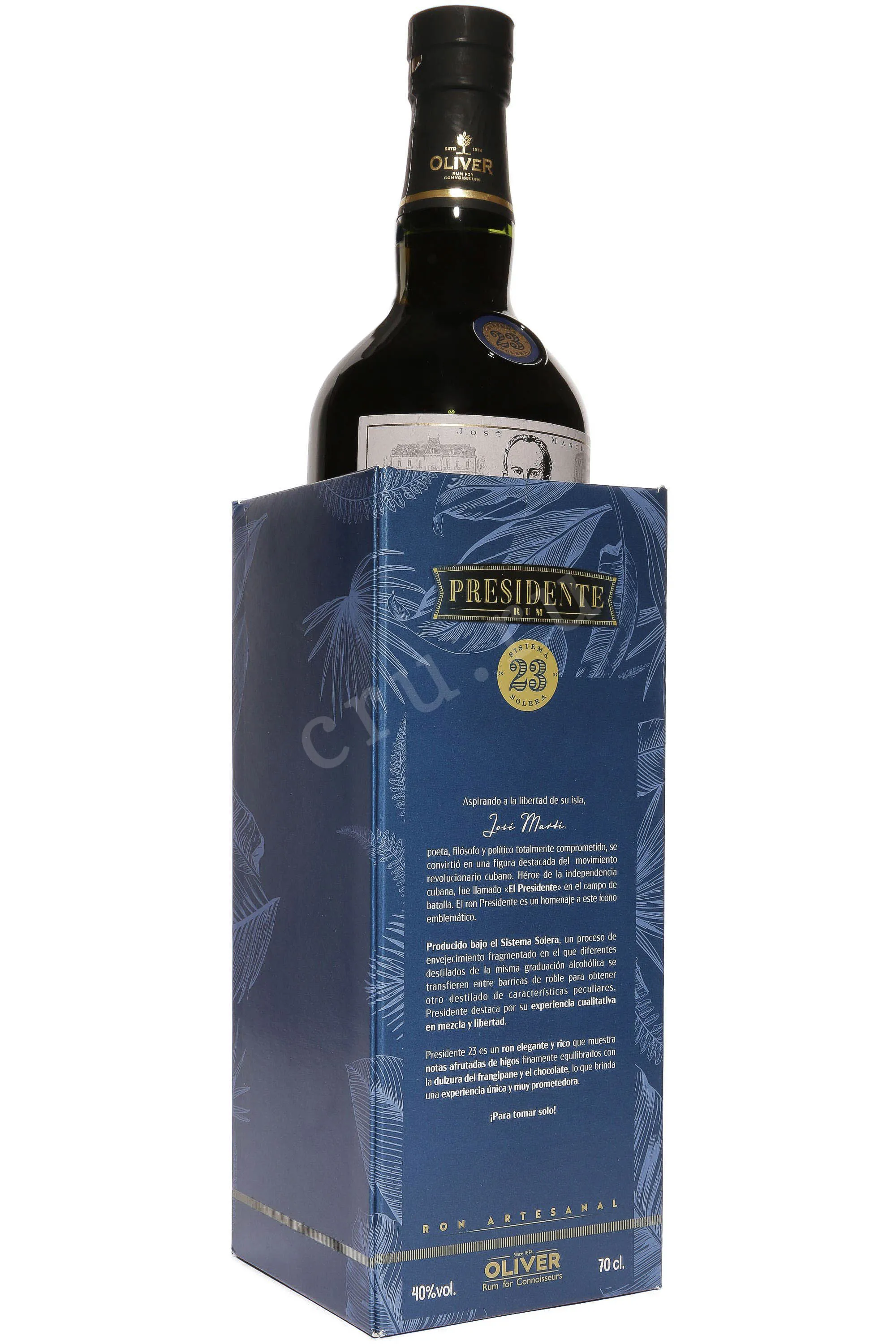 Ром Oliver Presidente Marti 23 года 0,7 л в подарочной упаковке — это престижный доминиканский дистиллят, созданный по испанской технологии солера. Он отличается длительной выдержкой, в процессе которой более молодые спирты постепенно объединяются со старыми, сохраняя сложность и глубину букета. В качестве сырья используется патока сахарного тростника, произрастающего в условиях тропического климата. Жаркое солнце, сезонные дожди и богатые минералами почвы Карибского региона позволяют растениям накапливать оптимальный уровень сахара. Благодаря этому готовый образец приобретает богатую структуру и выразительный характер. Длительное хранение в дубовых бочках, ранее использованных для созревания бурбона, придает напитку мягкость и многослойность.
