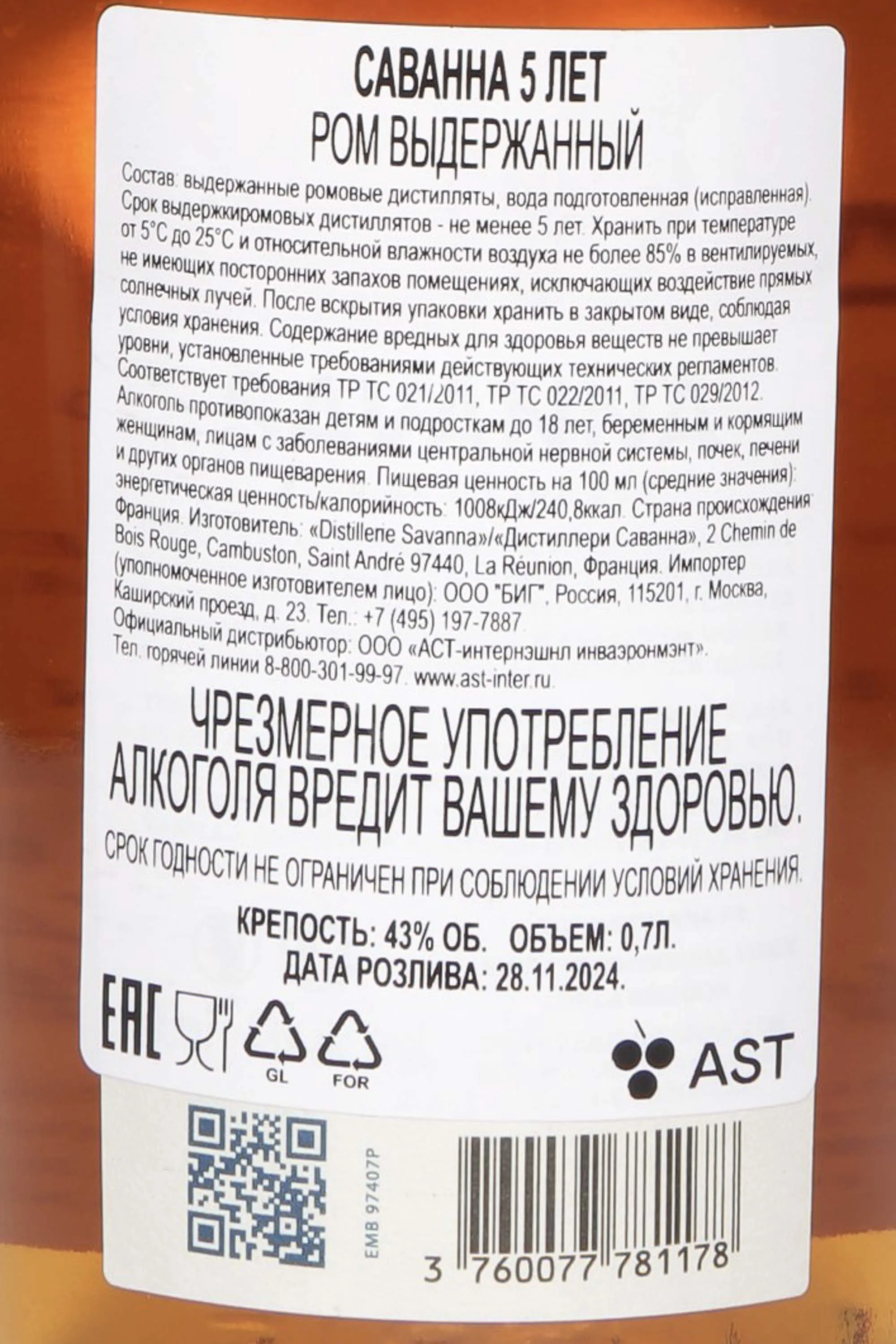 Ром Savanna 5 лет 0,7 л в подарочной упаковке создан на на острове Реюньон из тростниковой мелассы. Сусло проходит короткое брожение, которое занимает около суток, а затем перегоняется в классической колонне непрерывной дистилляции. Полученный спирт отправляется в бочки из французского дуба, ранее использовавшиеся для коньяка, где выдерживается в течение пяти лет под тропическим солнцем. Благодаря этому напиток приобретает насыщенный характер, соединяющий сладость и древесные тона. Пятилетний ром Саванна ценится критиками за гармоничный вкус и чистый стиль, неоднократно отмечался в обзорах специалистов и включался в подборки качественных островных сортов.