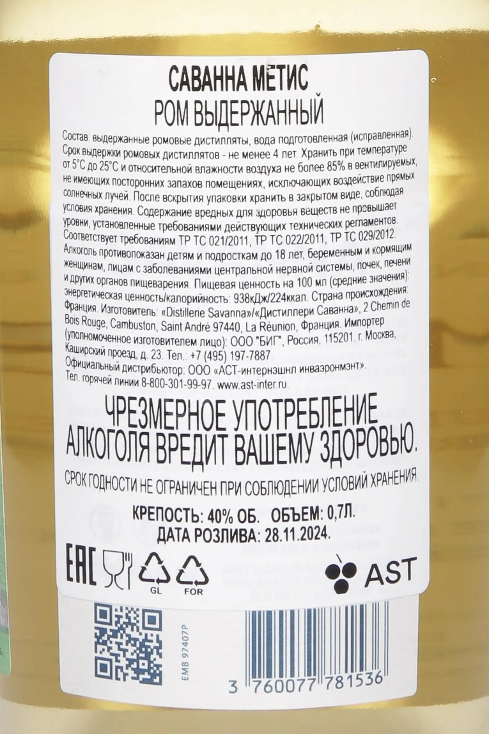 Ром Savanna Metis 0,7 л — это яркий образец с острова Реюньон. Сырьем для производства является меласса из местного сорта сахарного тростника. Сбраживание длится около суток, после чего проводится дистилляция в традиционной колонне непрерывного цикла. Полученные спирты выдерживаются до четырёх лет в больших бочках из французского дуба, ранее использованных для коньяка. Такой подход придаёт напитку мягкость, округлость и насыщенность. Саванна Метис сочетает стилистику традиционного и современного рома, сохраняя баланс между фруктовой свежестью и деликатной сладостью. Напиток получил положительные отзывы от критиков за чистоту вкуса и гармоничность букета.