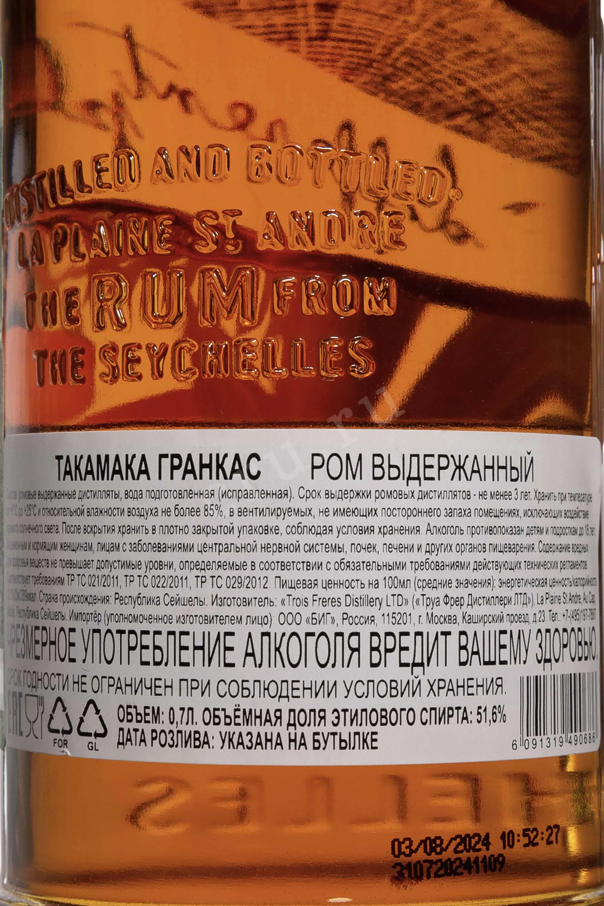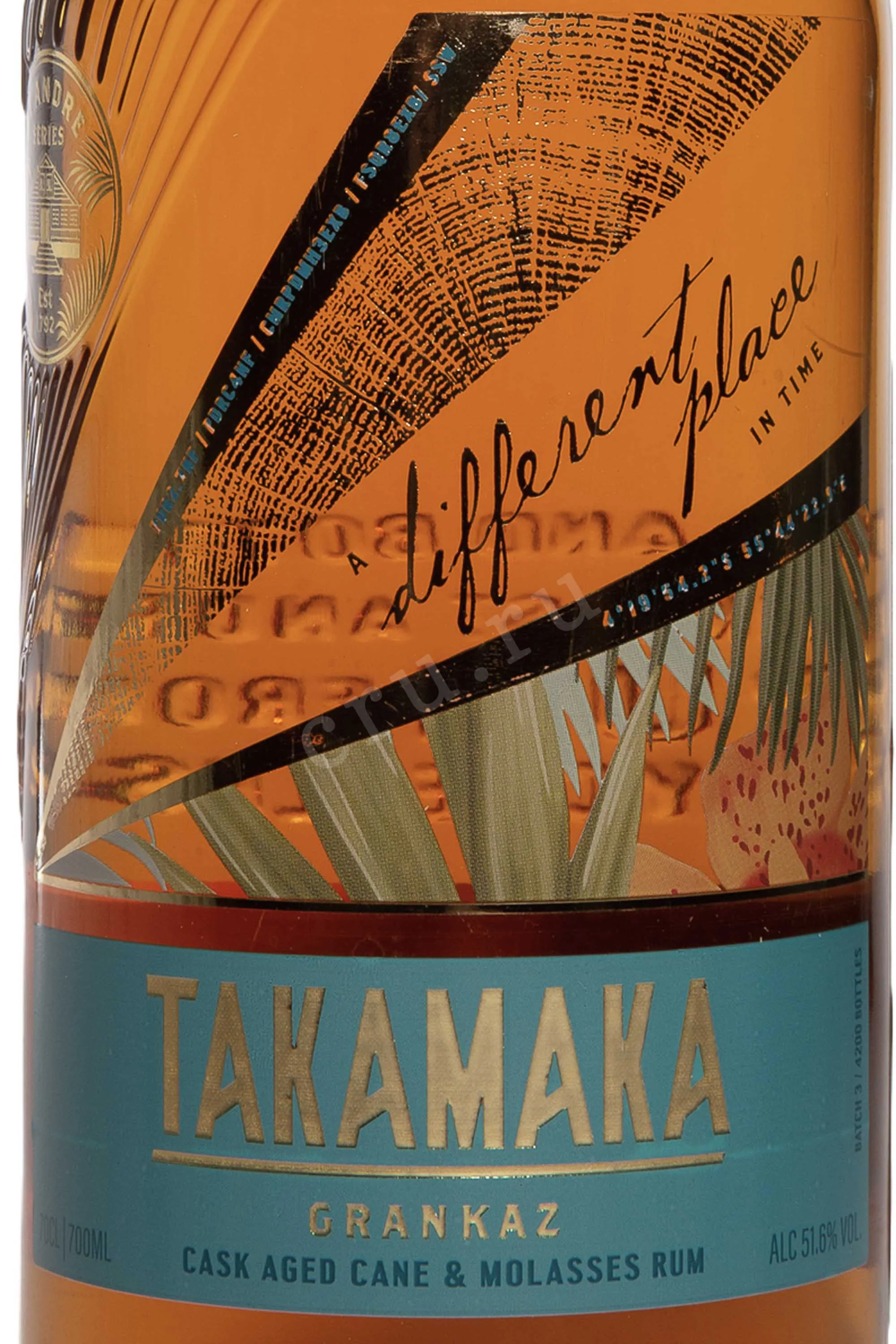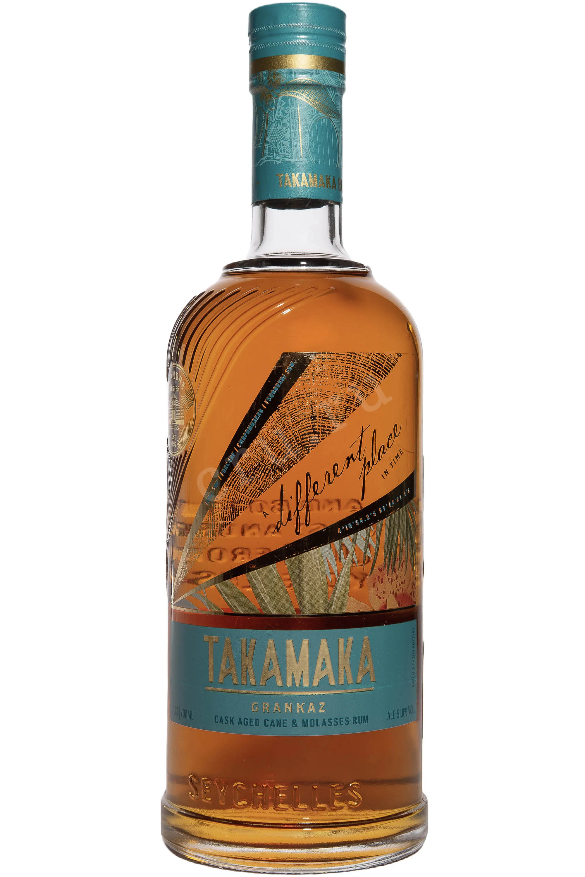 Ром Takamaka Rum Distillery Grankaz в подарочной упаковке 0.7 л — лимитированный, сейшельский, в стиле agricole, созданный как сложный купаж спиртов разного происхождения и возраста. Для производства используют сахарный тростник с нескольких участков острова Маэ и природную родниковую воду. Гранитные почвы с примесью пляжного песка формируют узнаваемый характер сырья. Тростник перерабатывают непосредственно на винокурне, ферментация проходит в стальных емкостях. В купаж входят спирты из свежего тростникового сока, дистиллированные в pot still и выдержанные 1,5 и 3 года в новых бочках из французского дуба средней обжарки. Их дополняет ром из патоки, созревавший 3 года в бочках из-под бурбона, а также 8-летний ром из мелассы с Барбадоса от Foursquare. Напиток входит в коллекцию St Andre, не содержит красителей и добавленного сахара, не подвергается холодной фильтрации. Выпущен ограниченным тиражом 4200 бутылок, что подчеркивает его коллекционный статус.