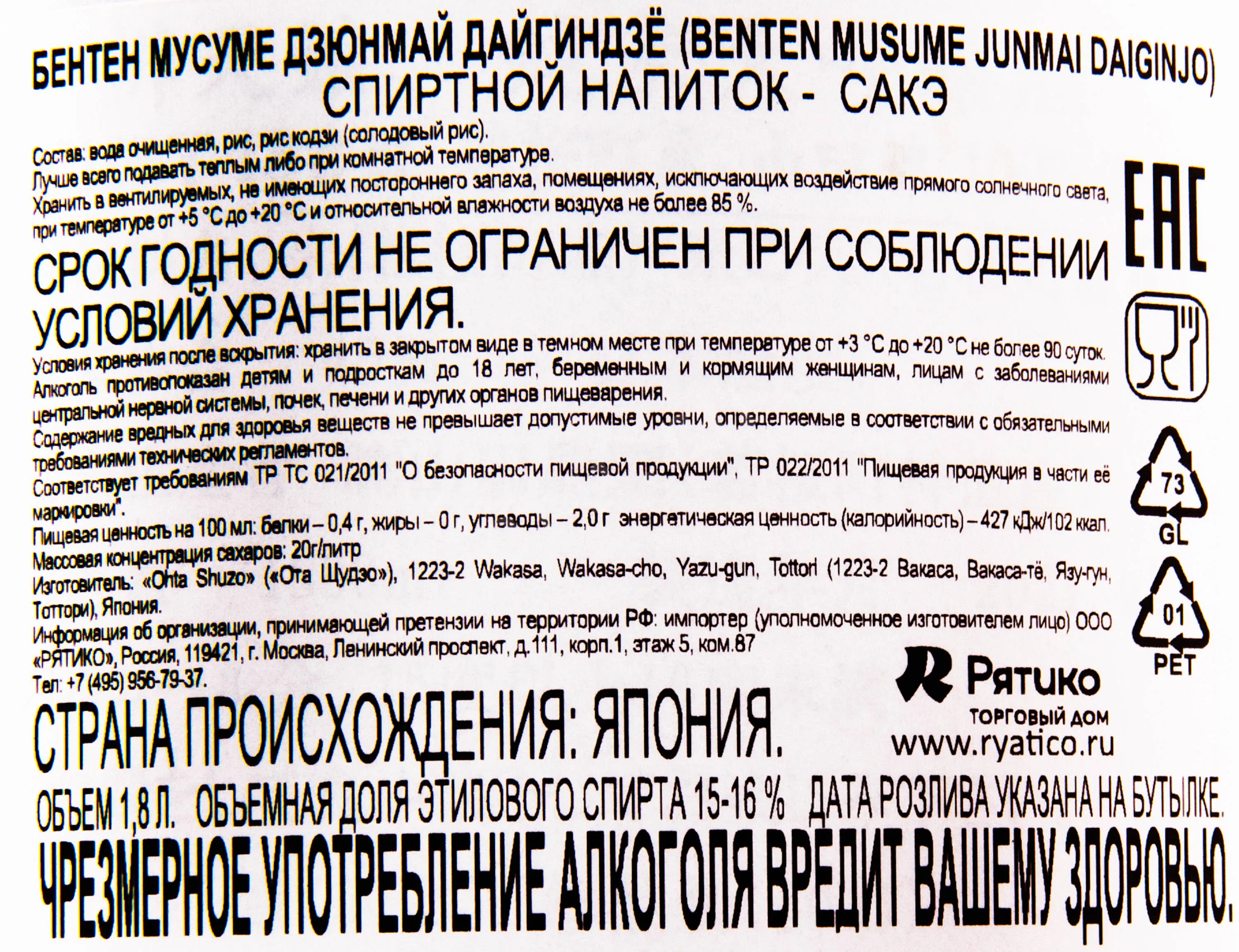 Benten Musume Junmai Daiginjo 1.8 л купить - Саке Бентен Мусуме Дзюнмай Дайгиндзё цена в магазине