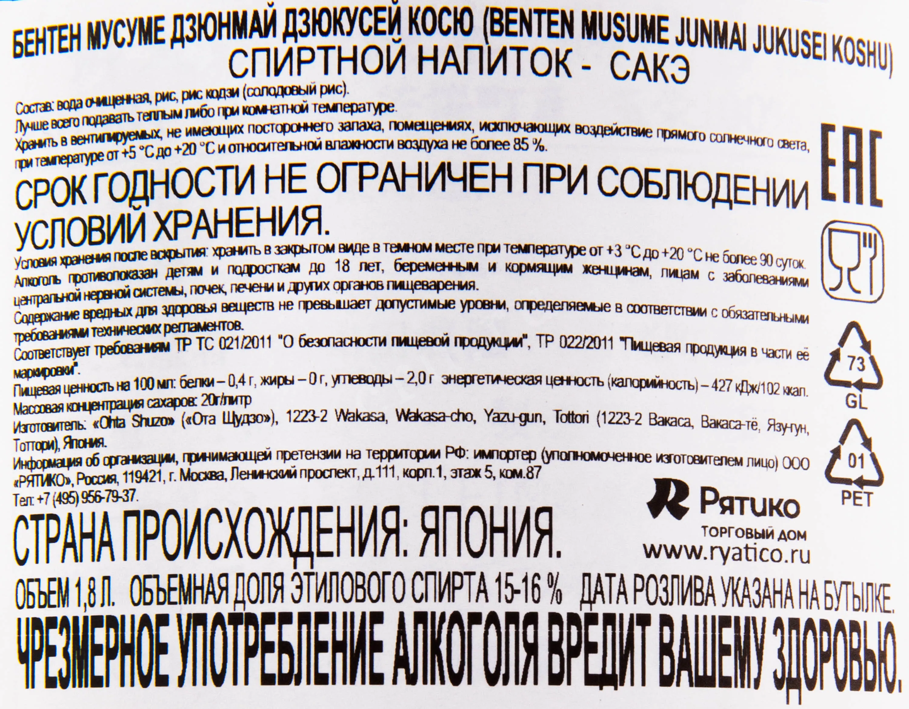 Саке Benten Musume Junmai Jukusei Koshu 1.8 л
