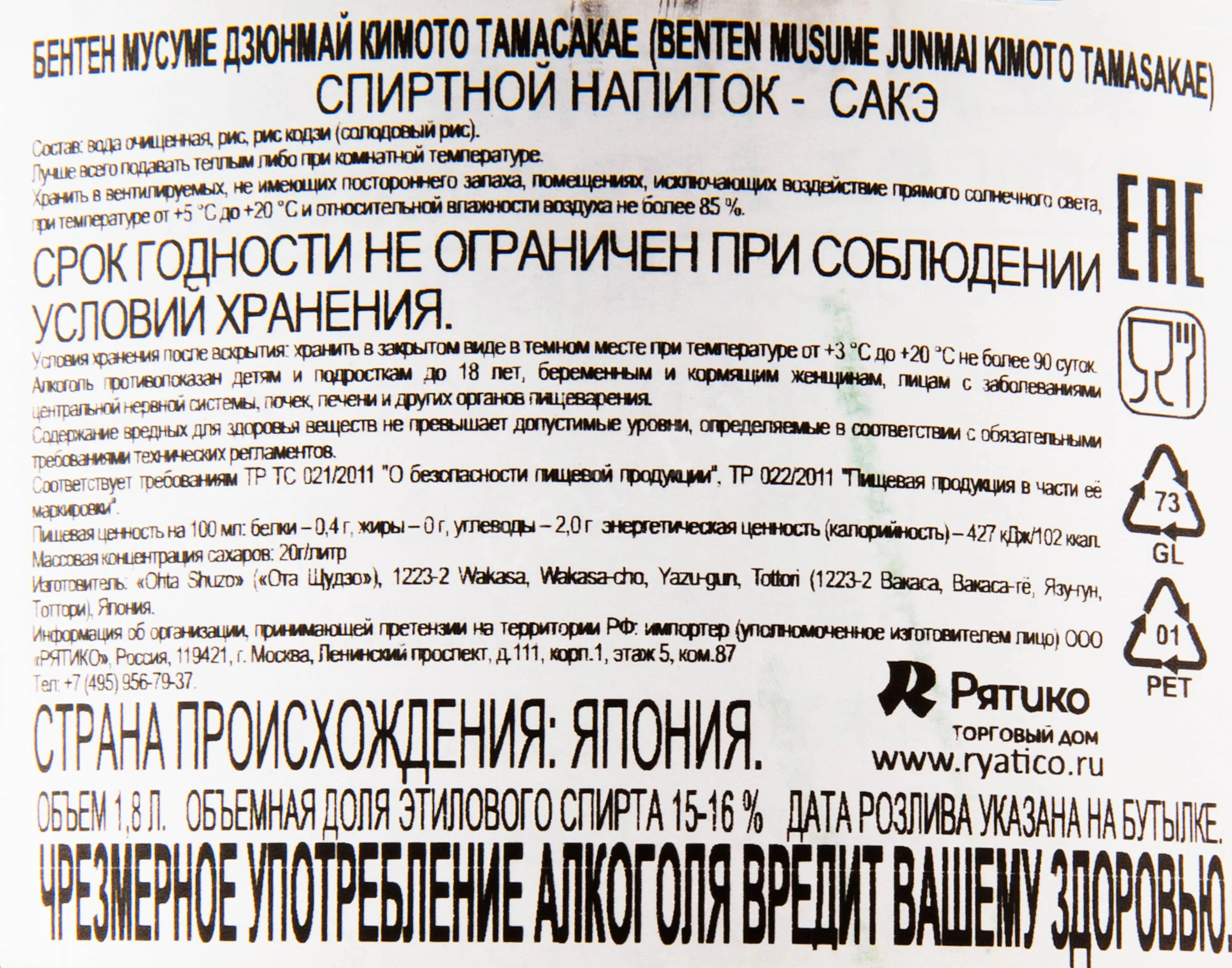 Саке Benten Musume Junmai Kimoto Tamasakae 1.8 л