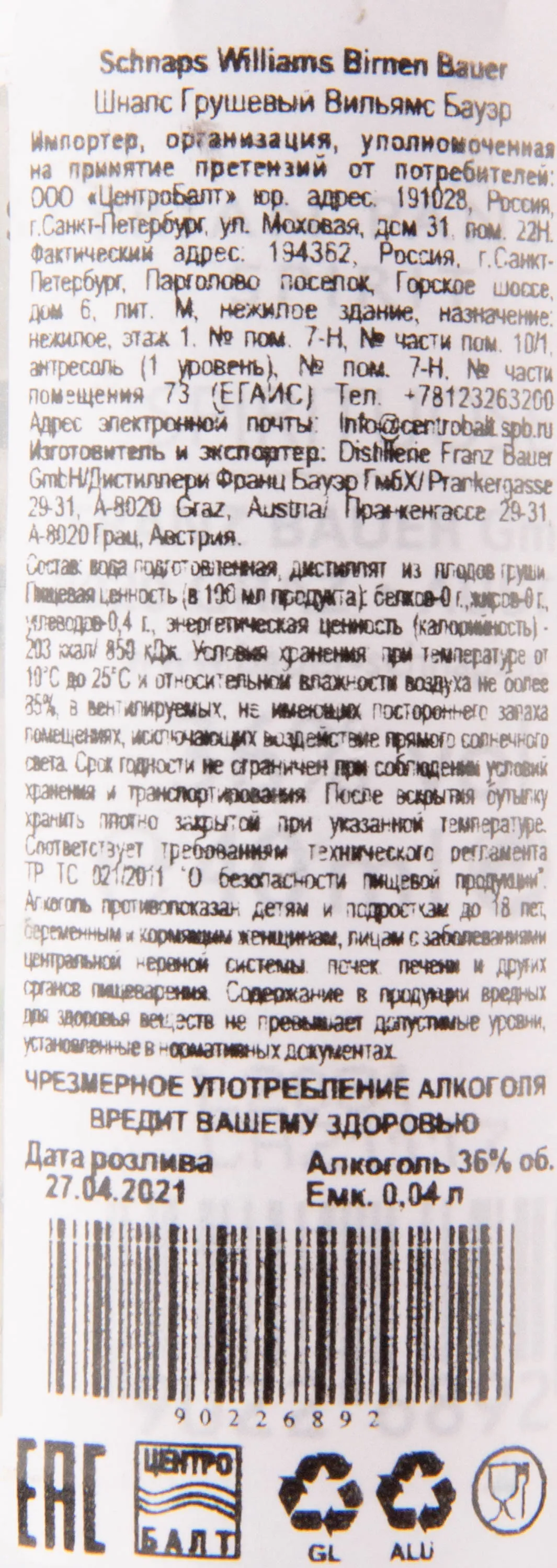 Bauer Williamsbirnen 0.04 л купить - Шнапс Бауэр Грушевый цена в магазине