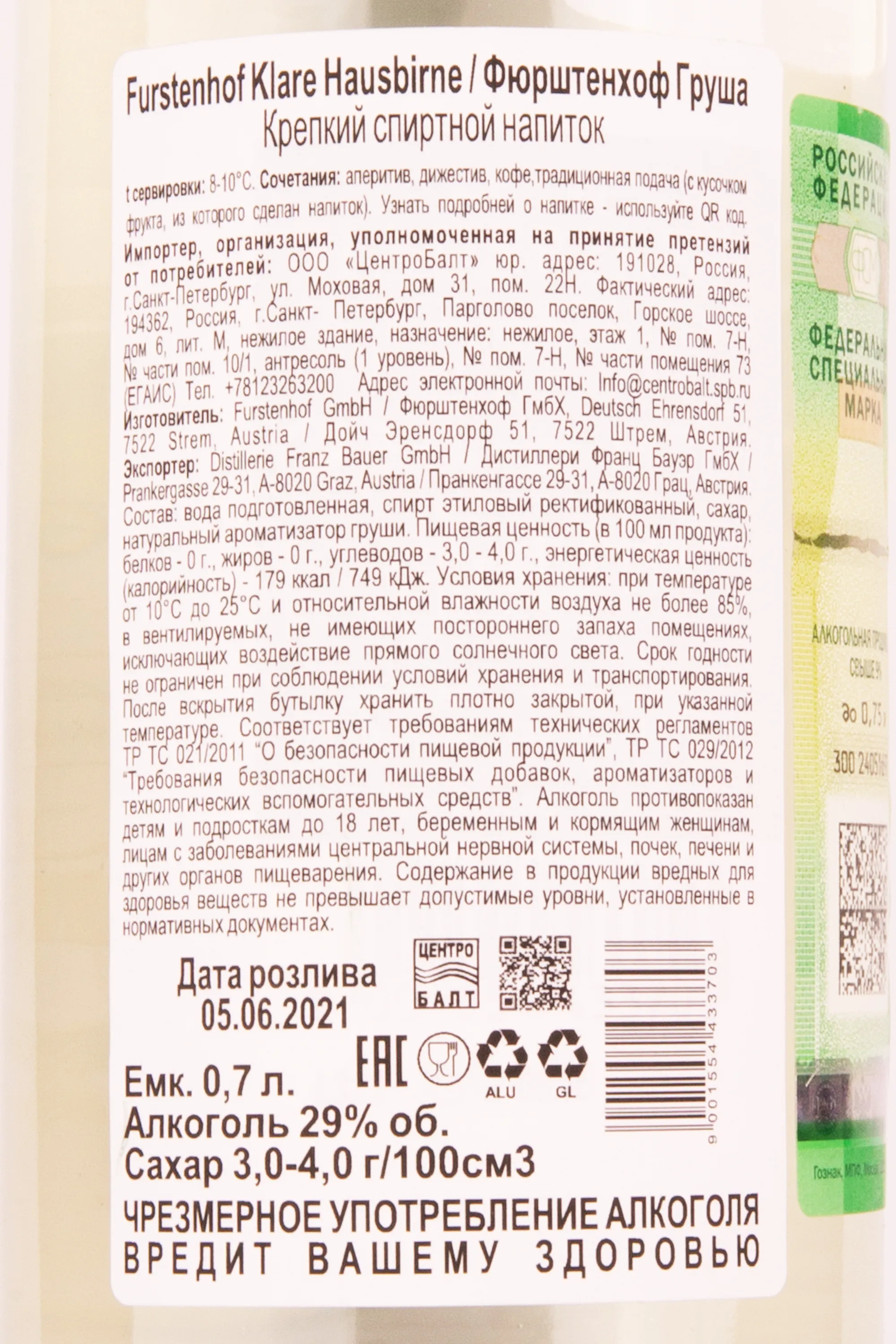 Furstenhof Klare Hausbirne 0.7 л купить - Шнапс Фюрштенхоф Груша цена в магазине