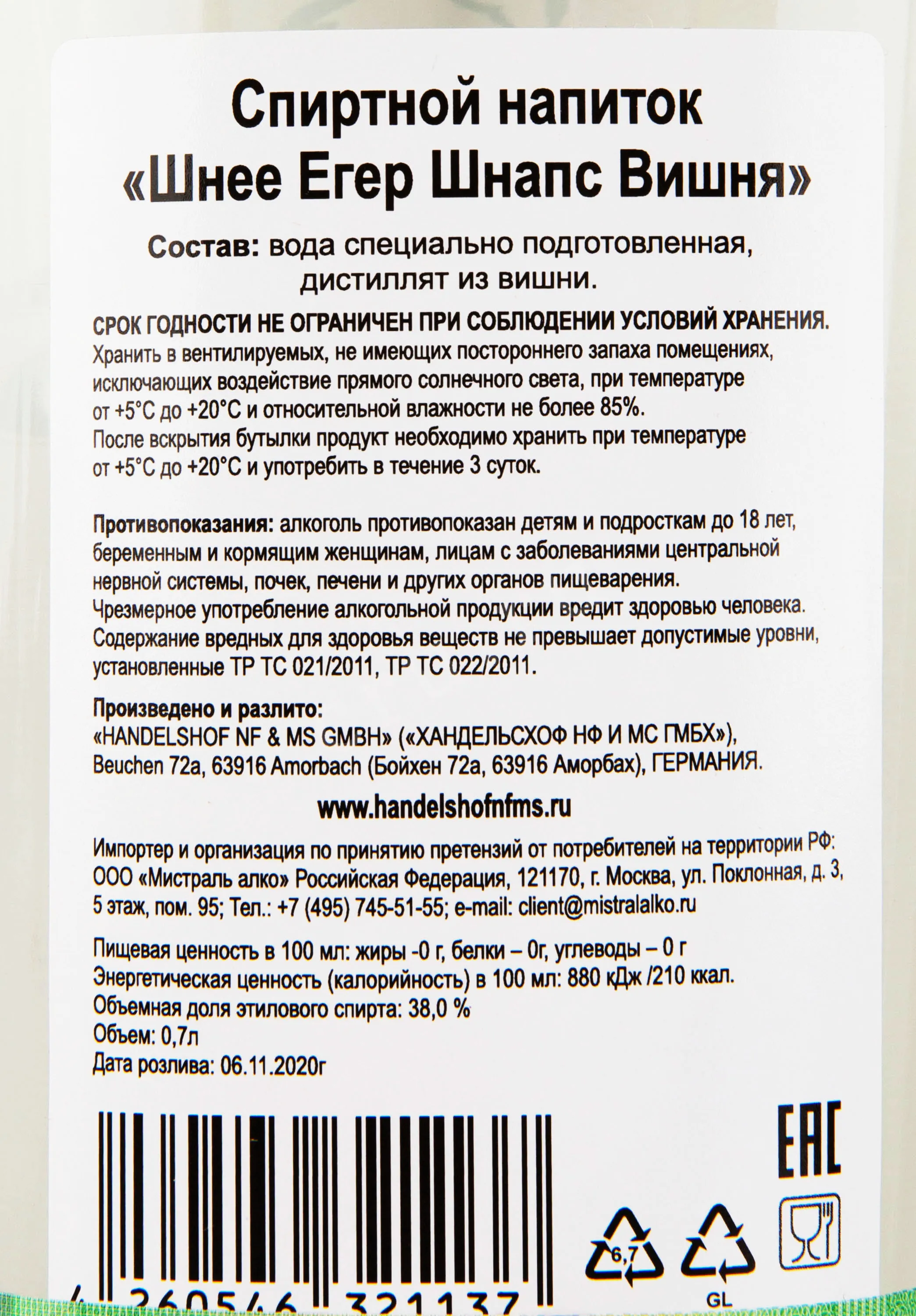 Шнапс Schnee Jager Kirsch-Wasser 0,7 л производится по традиционной технологии перегонки из спелой черной вишни. Для дистиллята отбирают только полностью зрелые плоды, собранные в сезон на южных склонах с умеренным климатом. Фрукты проходят естественную ферментацию, после чего подвергаются медленной дистилляции в медных перегонных кубах. Такой процесс позволяет сохранить насыщенный аромат и характерный вкус природного сырья. Напиток отличается кристальной чистотой и мягкой структурой, что делает его узнаваемым среди классических немецких фруктовых бренди. В отличие от зерновых дистиллятов, Кирш-Вассер основан исключительно на плодах и не содержит сахара или ароматизаторов, поэтому передает яркий ягодный характер своей основы.