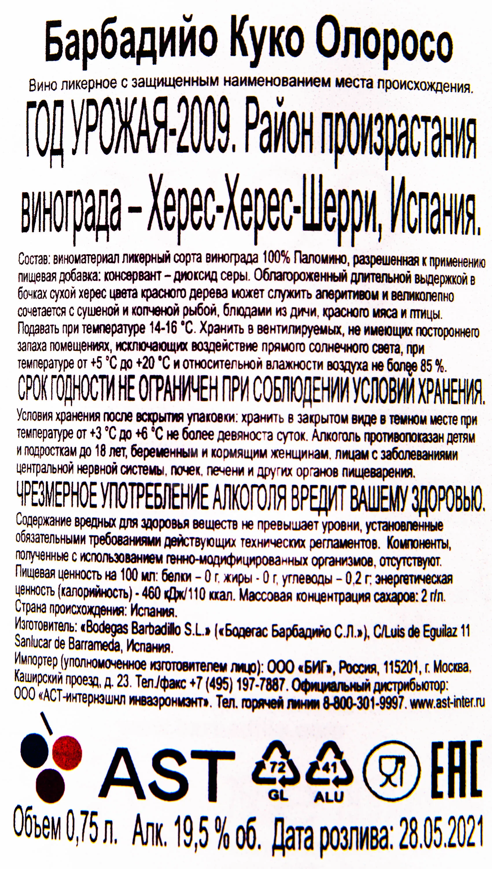 Barbadillo Cuco Oloroso 2009 0.75 л купить - Херес Барбадийо Куко Олоросо цена в магазине
