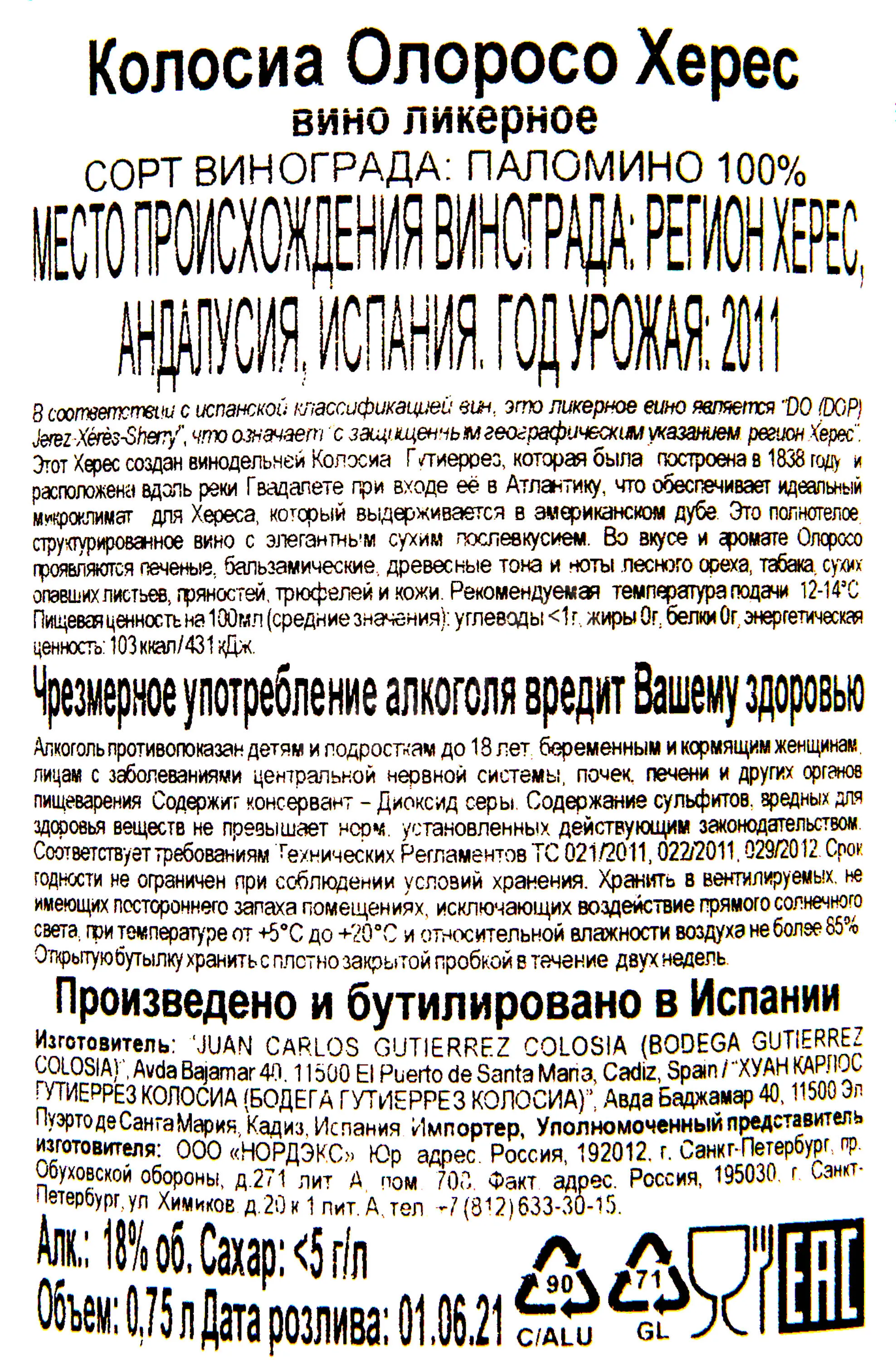 Colosia Oloroso 2011 0.75 л купить - Херес Колосиа Олояросо цена в магазине