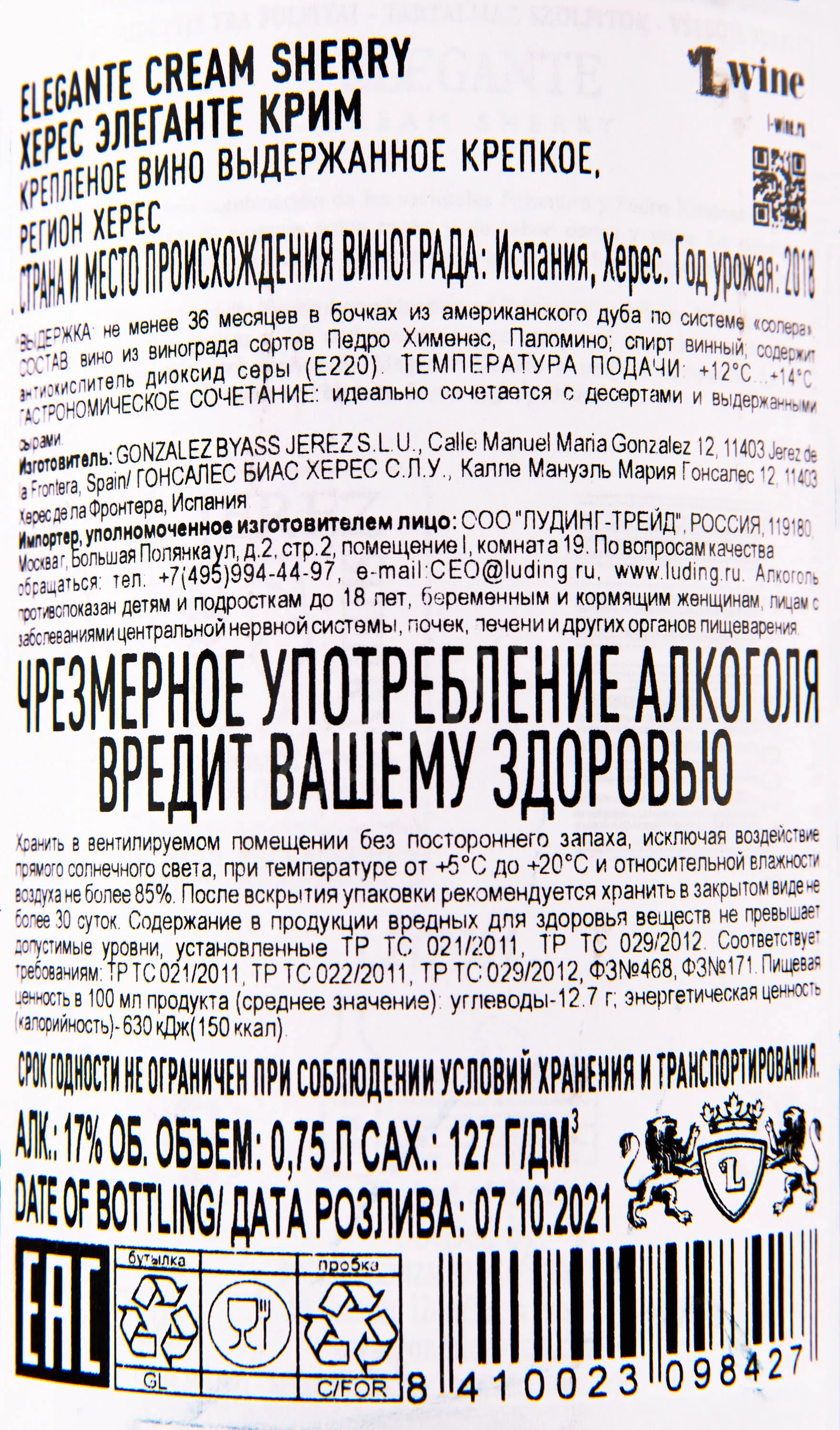 Gonzalez Byass Elegante Palomino-Pedro Ximenez Jerez Cream 2018 0.75 л купить - Херес Гонзалез Биасс Элеганте Паломино-Педро Хименес Крим цена в магазине