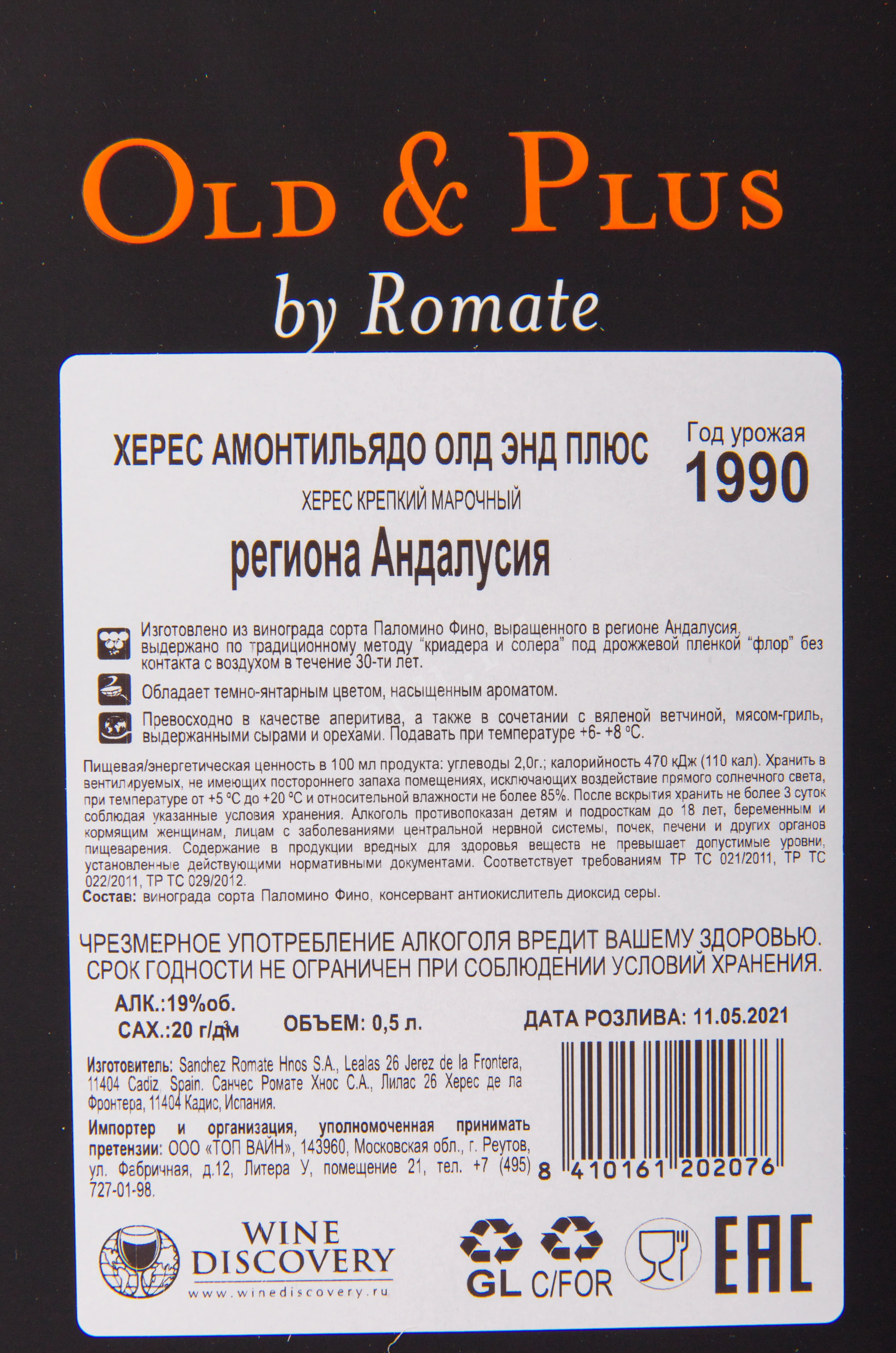 Old & Plus by Romate Amontillado 0.75 л купить - Херес Олд & Плюс Ромате Амонтильядо цена в магазине