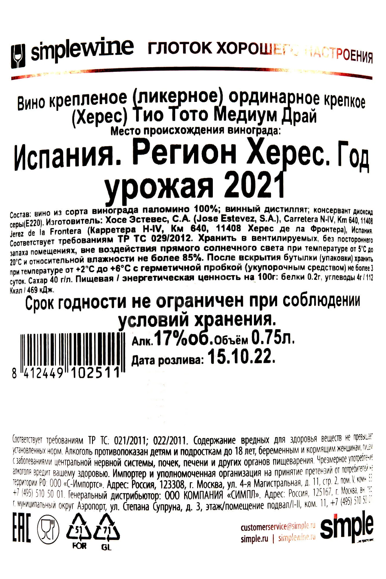 Херес Tio Toto Medium Dry 2021 0.75 л