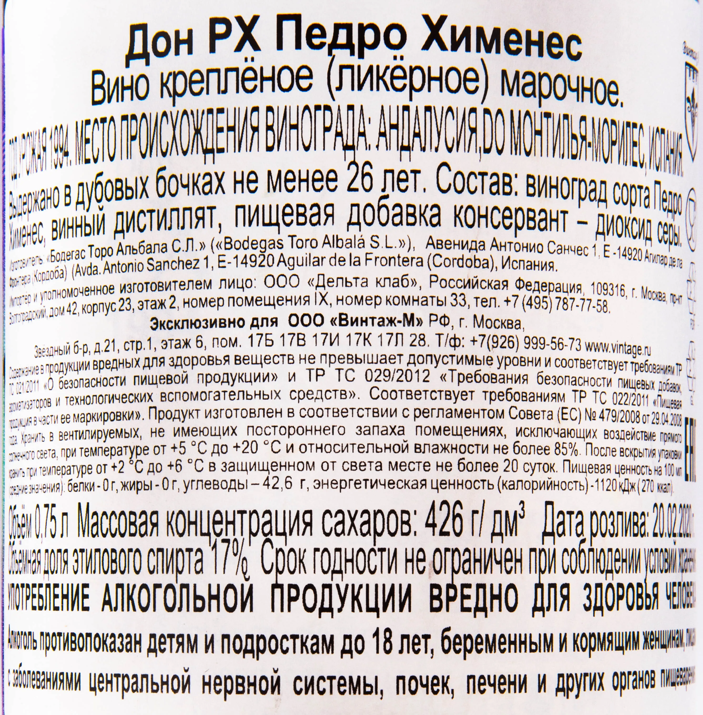 Херес Toro Albala Don Pedro Ximenez 1994 год 0,75 л — изысканный напиток, созданный из винограда-автохтона Педро Хименес позднего урожая (сбор проводился в течение одного года), выращенного в солнечном регионе Андалусия. Этот 17-градусный алкоголь выдерживался по традиционной системе солера на протяжении нескольких десятилетий, что придало ему уникальную глубину и сложность. Напиток произведен в ограниченных количествах, каждый этап изготовления контролировали и выполняли вручную, чтобы сохранить характер и богатство вкуса.