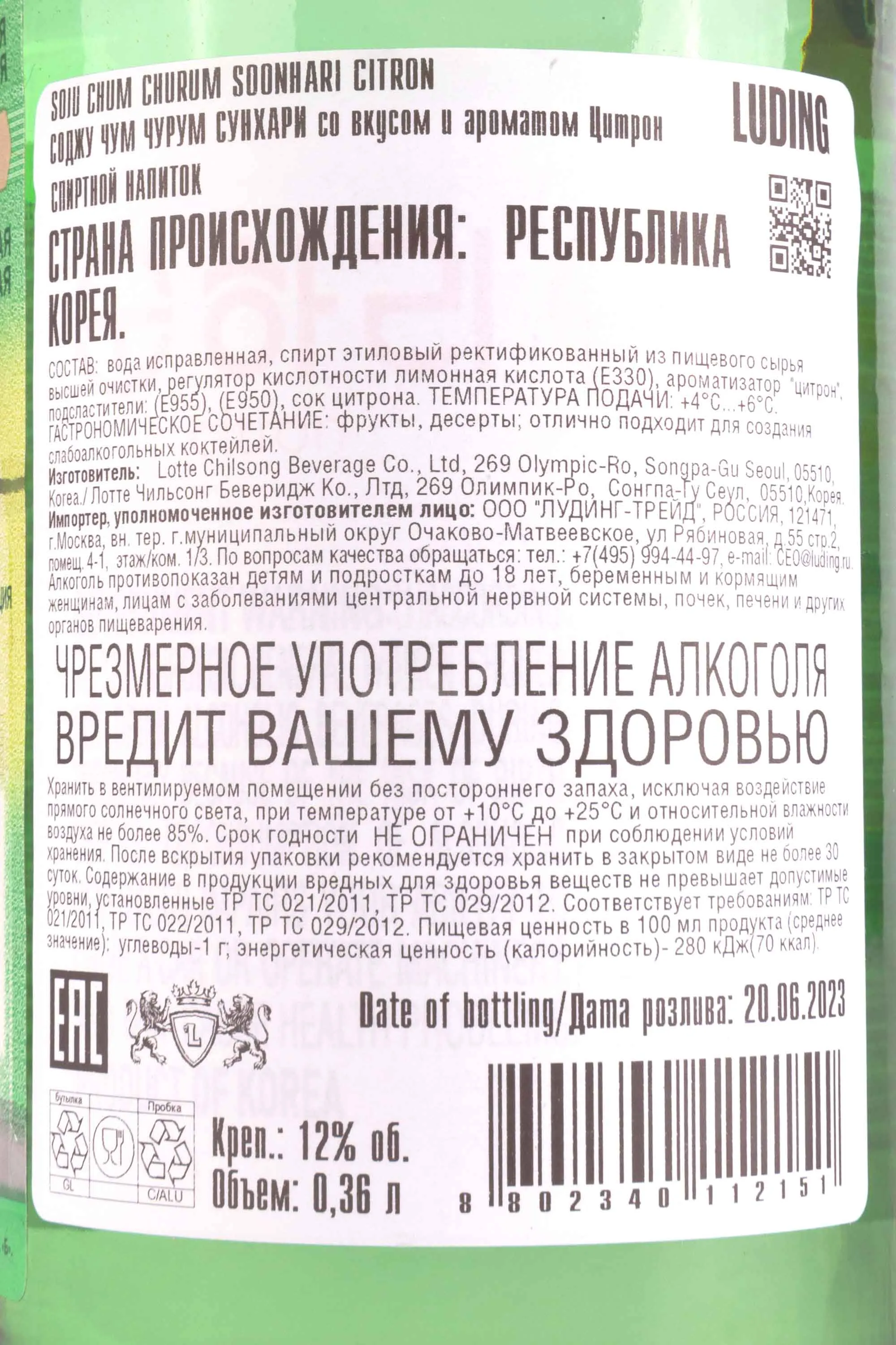 Чум Чурум Сунхари Цитрон 0.36 л купить Соджу Chum Churum Soonhari Citron цена в магазине КРЮ ПРОФИ