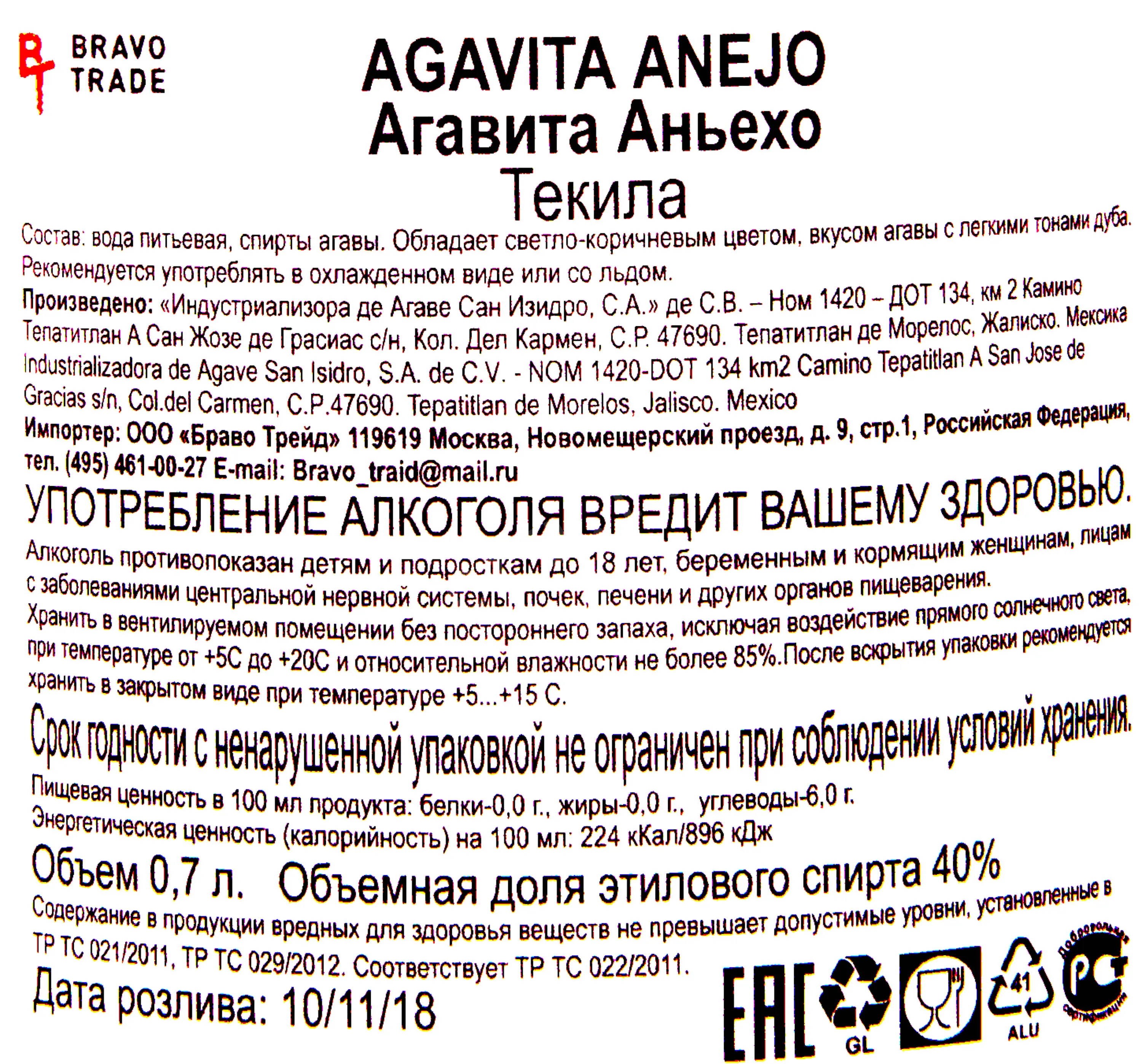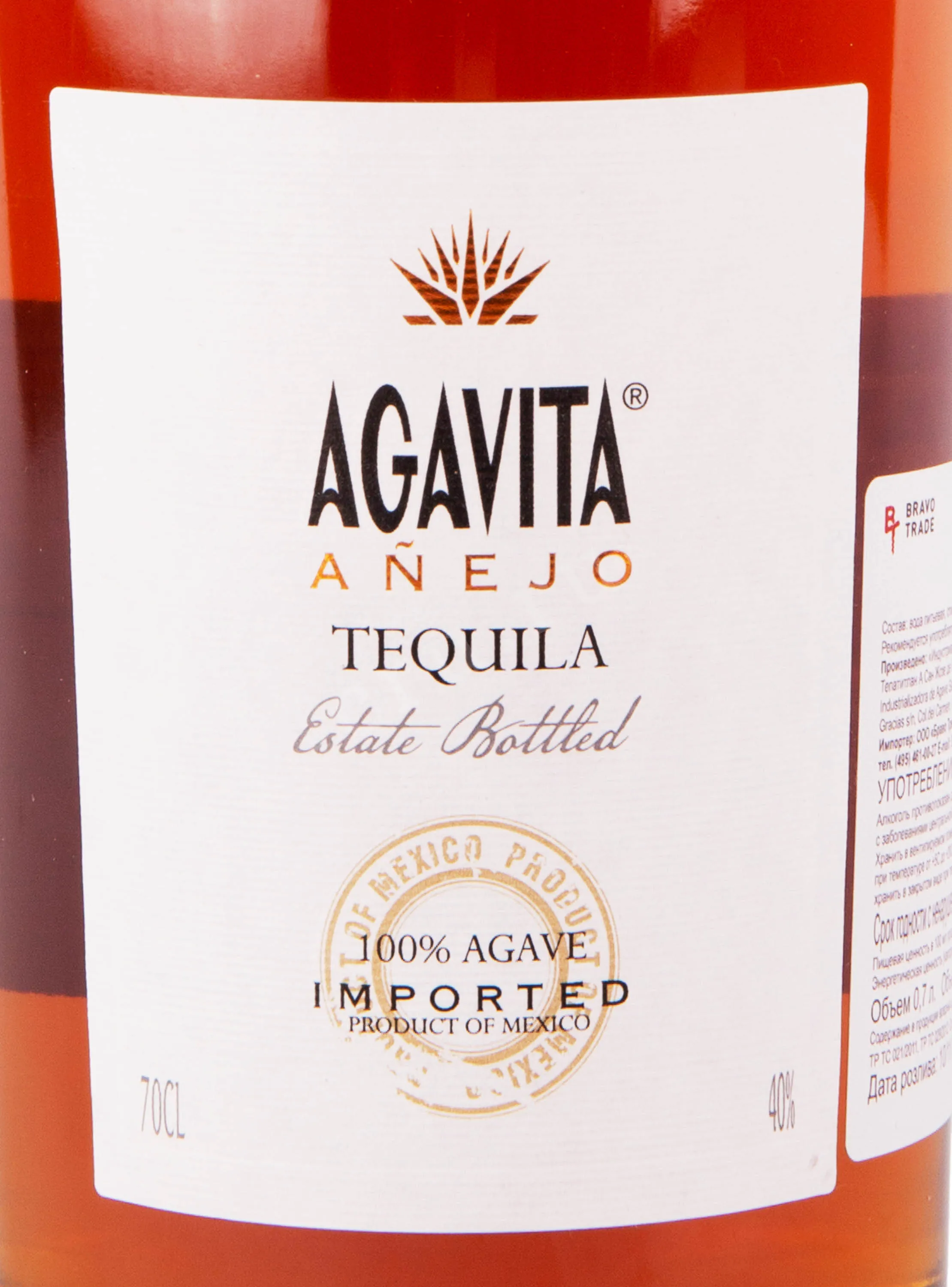 Текила Agavita Anejo 0.7 l – это мексиканский золотой алкоголь, изготовленный из дистиллятов свежего сока голубой агавы элитного сорта Вебер. Для придания особых органолептических качеств в напиток добавляется карамельный сироп. 40-процентная текила выдерживается в дубовых бочках от 2-х до 4-х лет, а после бутилируется и выпускается лимитированными партиями.
